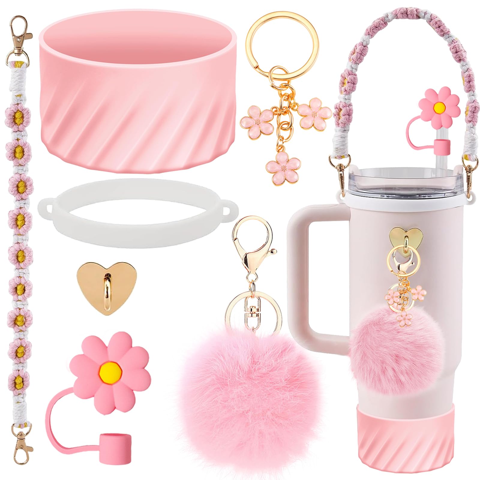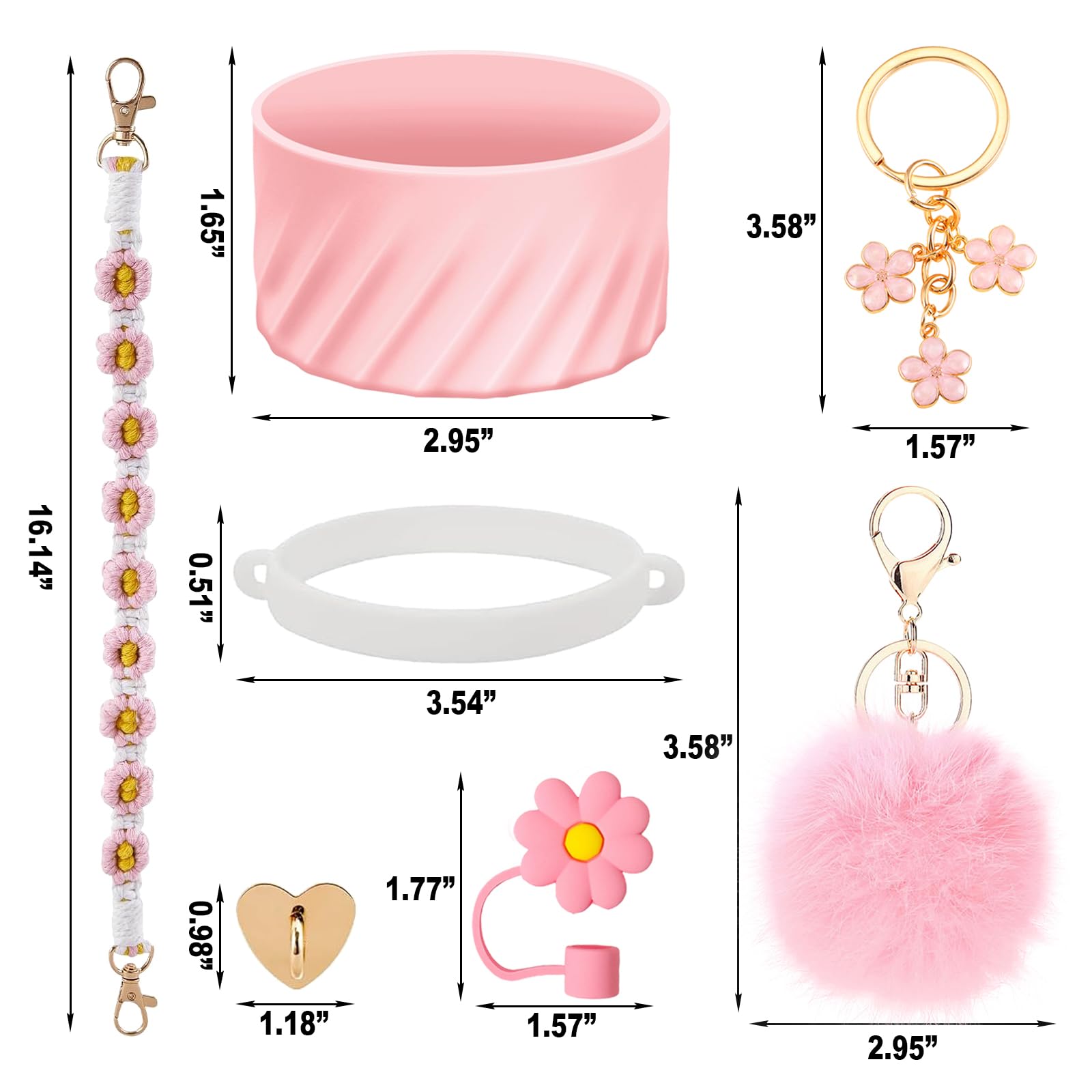 - Set Included: 1PCS water bottle handle strap, 1PCS water bottle silicone boot, 1PCS rubber cup ring, 1PCS silicone straw cover, 1PCS plush ball, 1PCS heart hook, 1PCS flowers keychain charm.