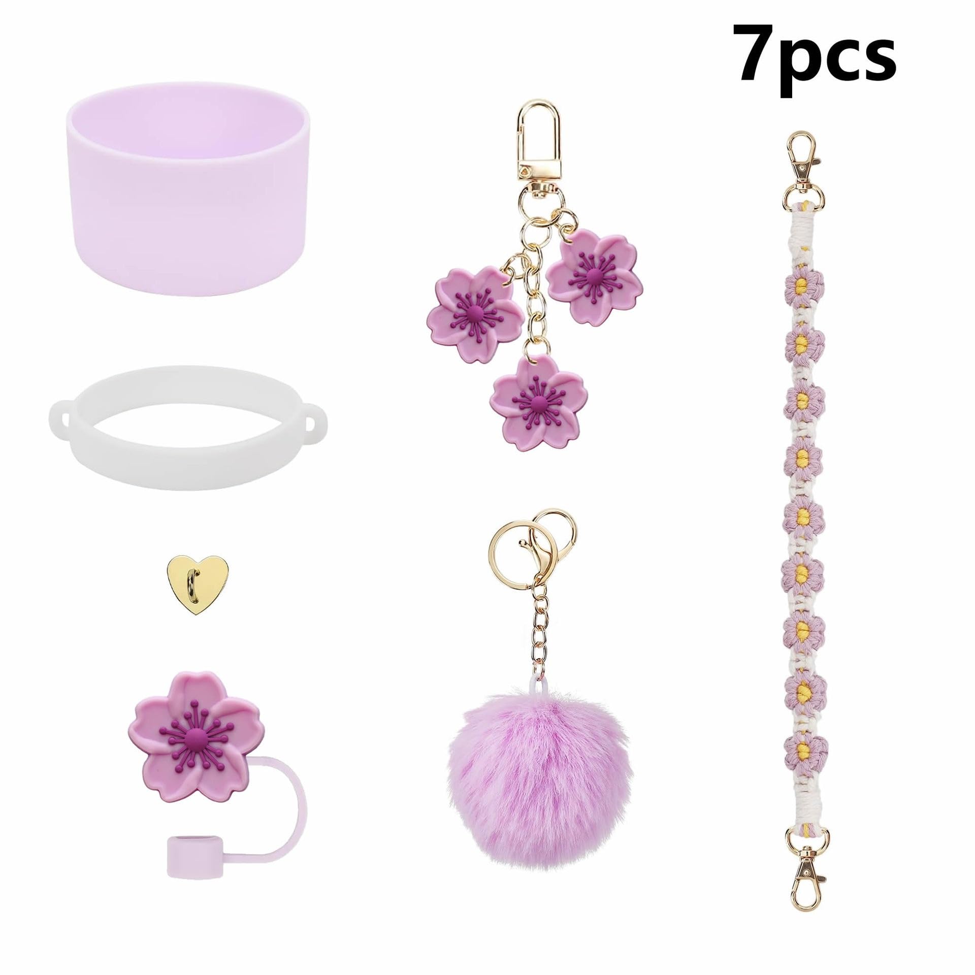 7pcs Cup Charms for Stanley Cup Accessories, Straw Cover Cap & Water Bottle Silicone Boot for Stanley Cup 30oz or 40oz Tumbler Cup Accessories, Handle Strap with Flower Charms for Stanley Cup(Purple)