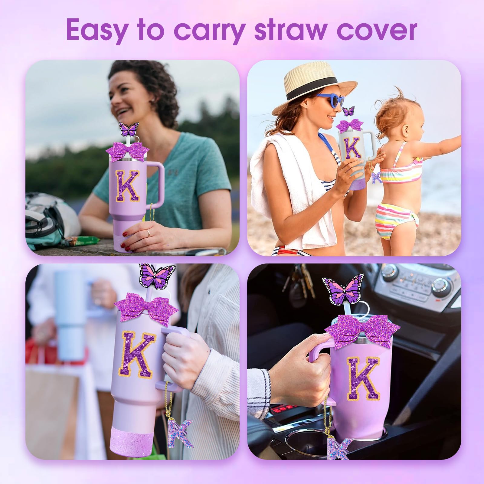 7Pcs Purple Stanley Cup Accessories Set for Stanley Cup 30&40 Oz Tumbler - Silicone Straw Cover Cap and Boot, Letter Charm for Handle, Spill Proof Stopper, Bow straw Decoration, Initial Sticker(K)