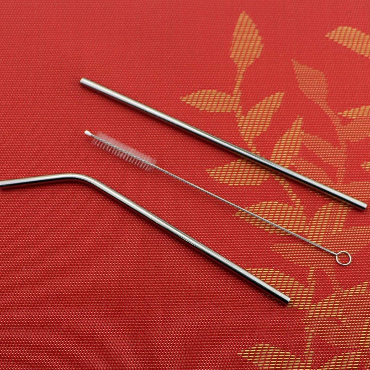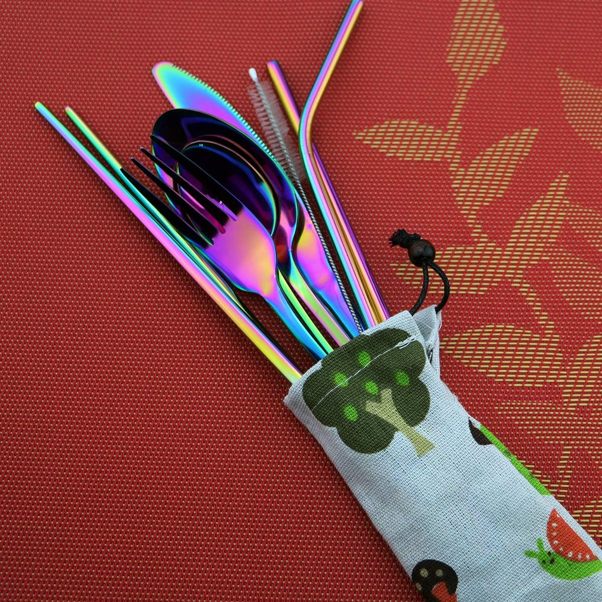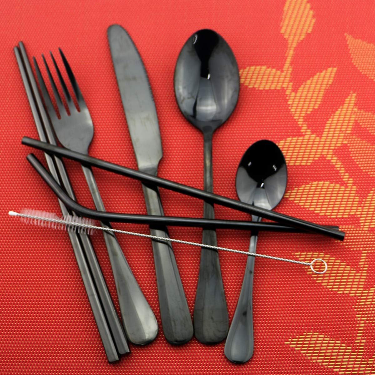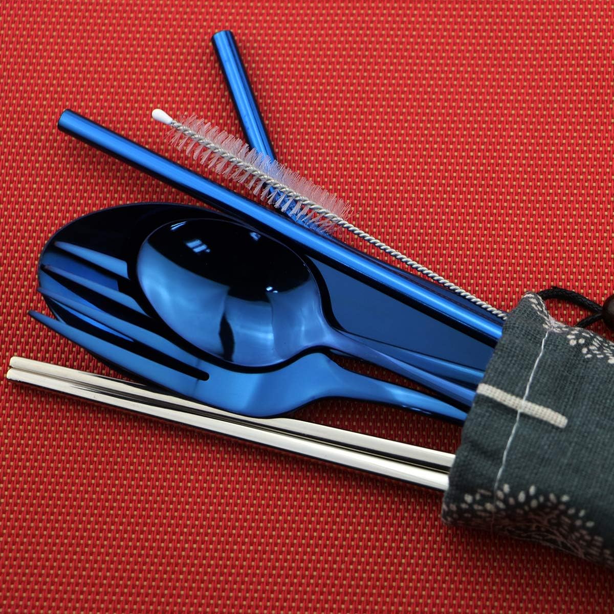 1. 8-piece stainless steel travel cutlery set include a spoon, fork, knife, chopsticks and two straws with cleaning brush.