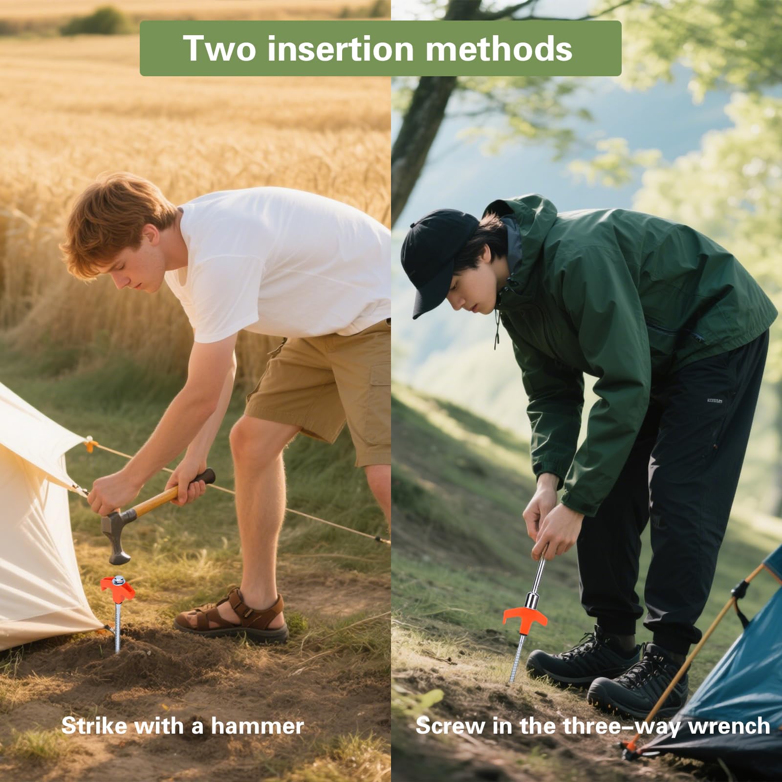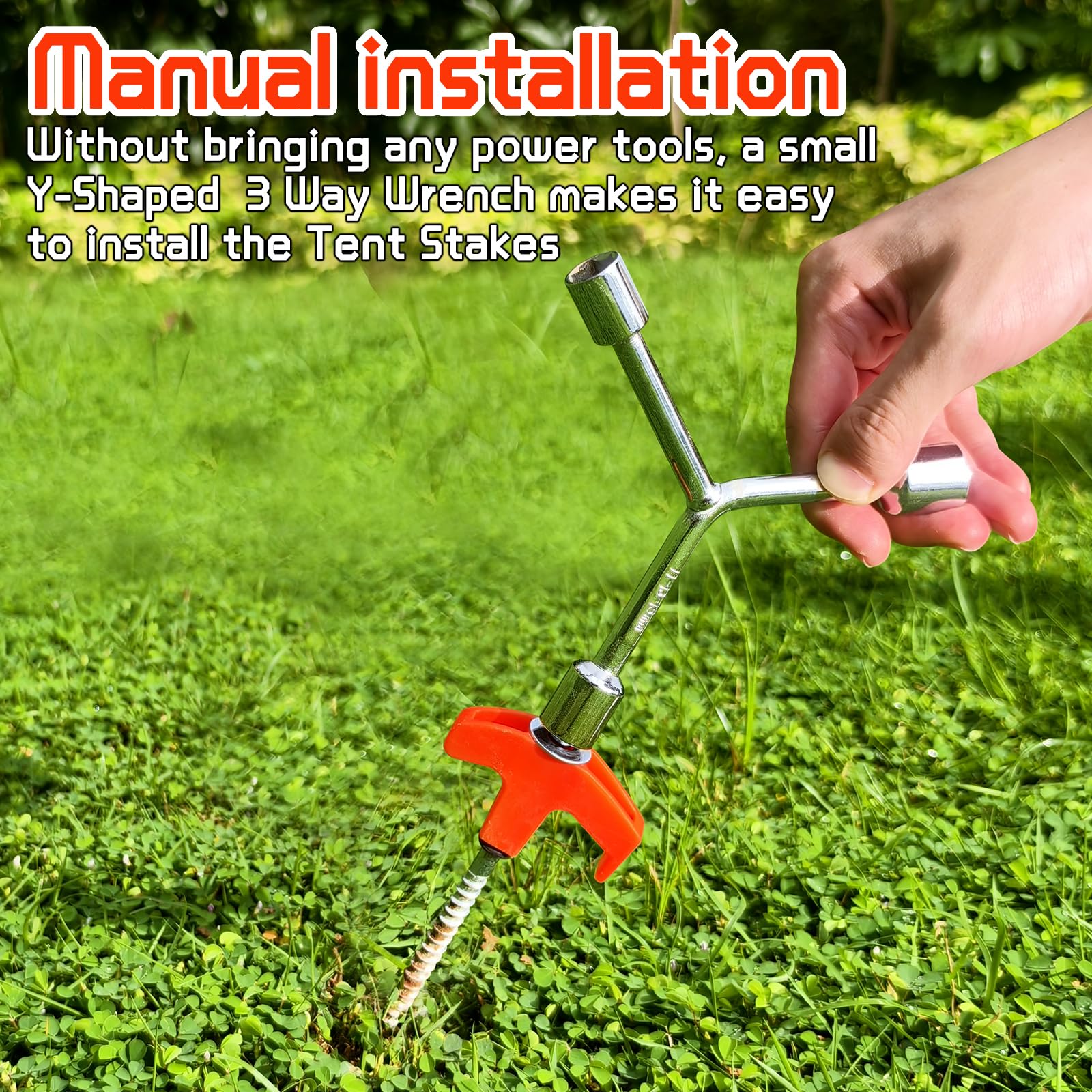 - 【EASY INSTALLATION】: Use a Y-shaped wrench to quickly and easily install tent stakes heavy duty. Within seconds, you can securely secure your tent, canopy, pavilion, sunshade, cable or waterproof cloth to the ground, simplifying your installation process. No use of any electric tools, just a small Y-shaped wrench is enough