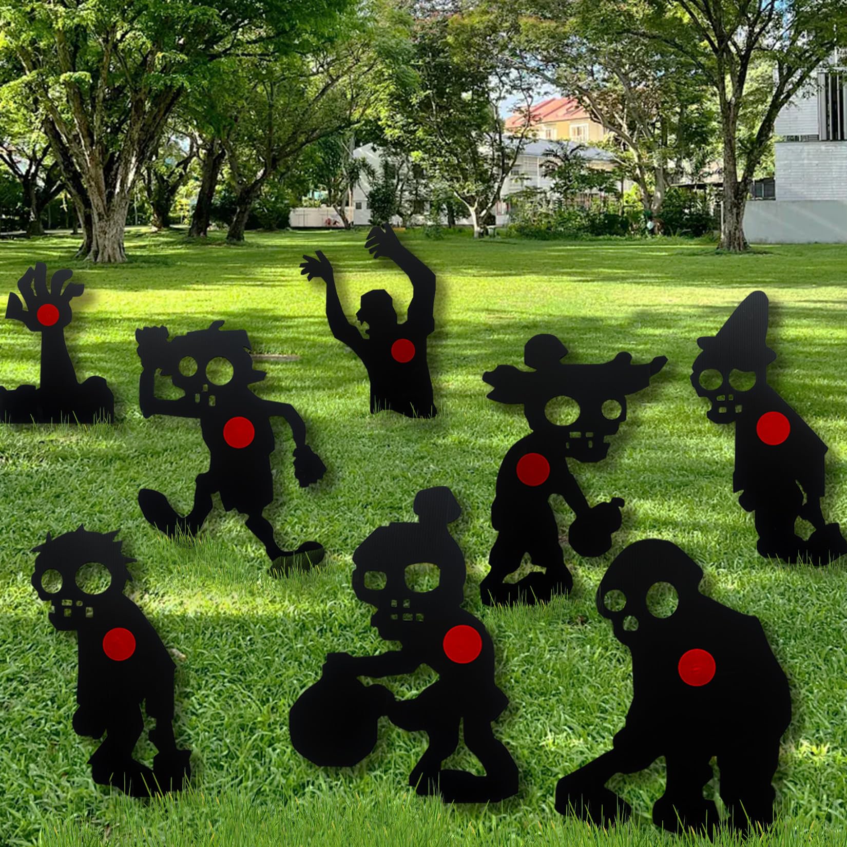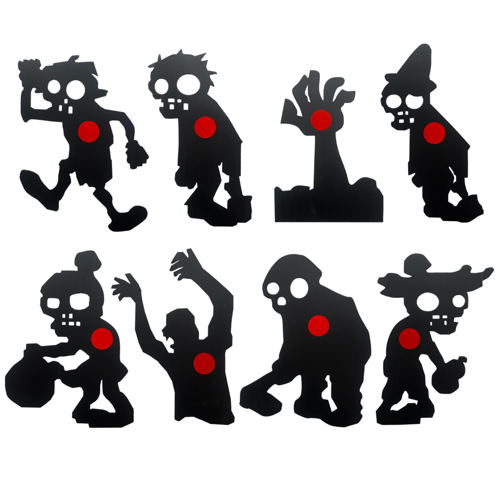 - 8 Zombie Waterproof Targets,12 * 16 Inch Different Black Zombie Archery Targets for Backyard Silhouette Yard Sign with Wooden Stakes. Package includes 8 hobgoblin shaped targets made of waterproof, weather-resistant corrugated plastic, comes with 16 fiberglass piles.
