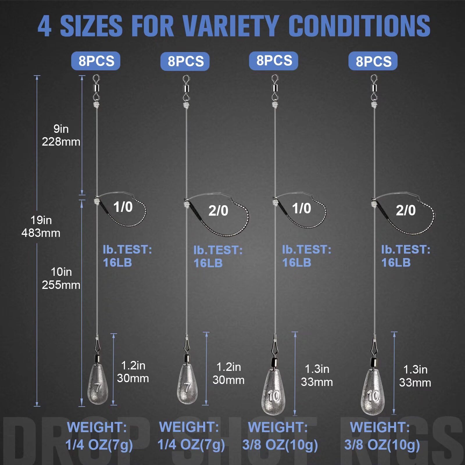 - What Will You Get: 4 sizes of drop shot rig kits are available: hooks size: 1/0 & 1/4 OZ(7g) Weight-8PCS, hooks size: 1/0 & 3/8 OZ(10g) Weight-8PCS, hooks size: 2/0 & 1/4 OZ(7g) Weight-8PCS, hooks size: 2/0 & 3/8 OZ(10g) Weight-8PCS. Fluorocarbon Line Lenght: 7.7in/195mm, meet your fishing needs. It truly is a do-all rig that will catch fish whether you're fishing from a boat or from the shoreline. Attention: Drop Shot Rigs SIZE is showed at Sixth Picture in the Detail Page.