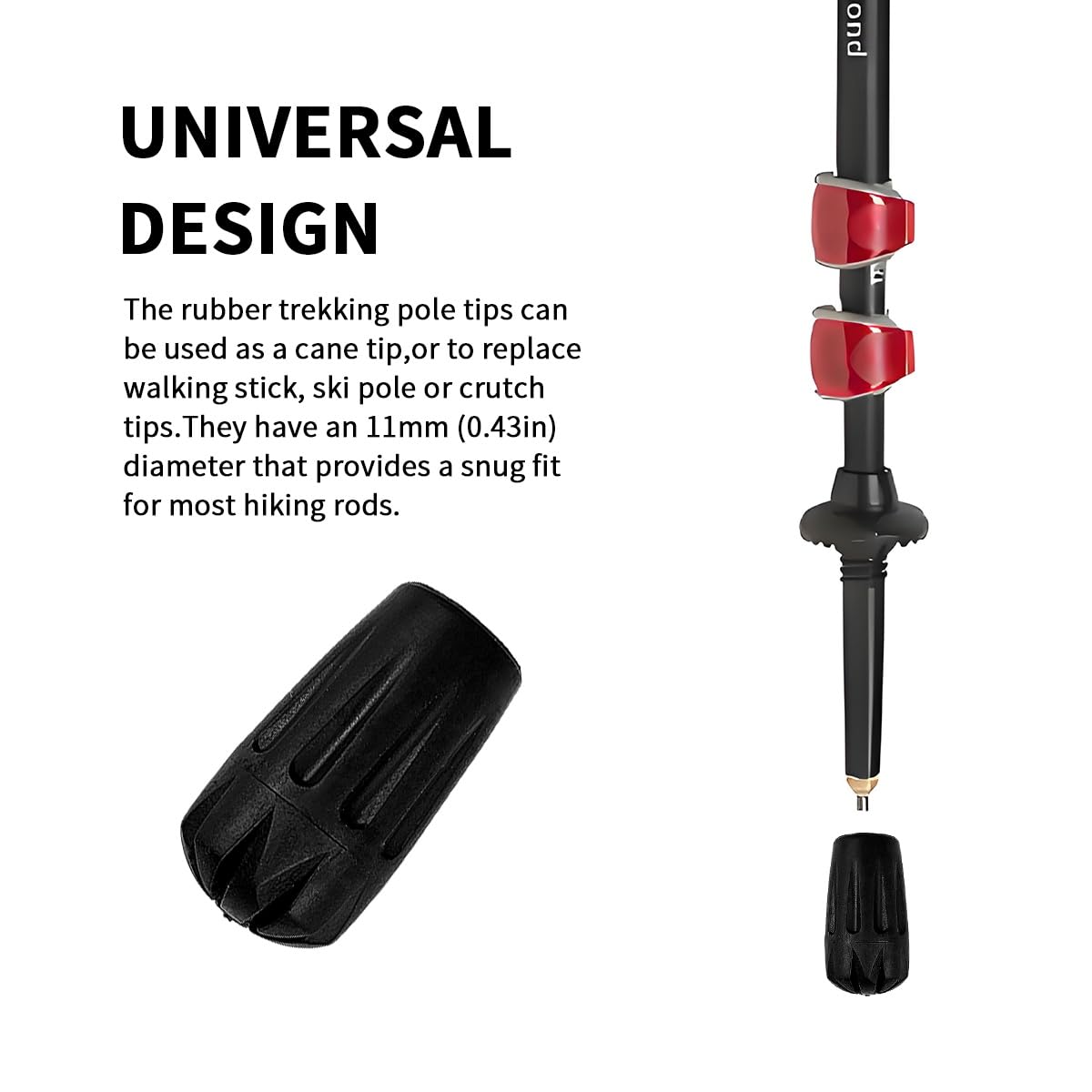 - UNIVERSAL : Our trekking pole tips can be used as a cane tip, or to replace walking stick, ski pole or crutch tips. They have an 11mm (0.43in) diameter that provides a snug fit for most hiking rods.