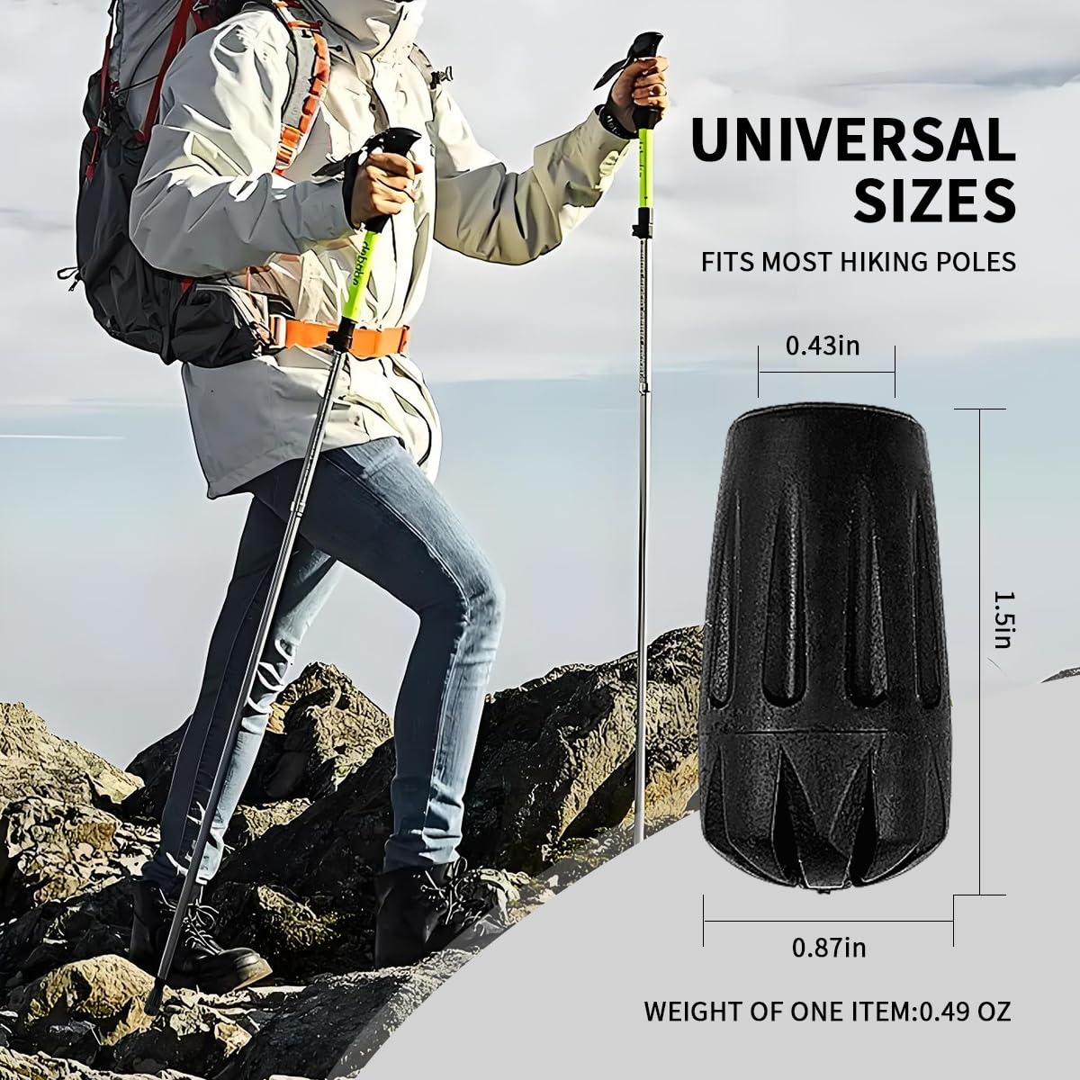 - EXTRA PROTECTION : These trekking pole tips help un-intentional wear and tear of walking sticks' metal tips, effectively extend the lifetime and usability of those hiking poles.They also help prevent damage to the environments.