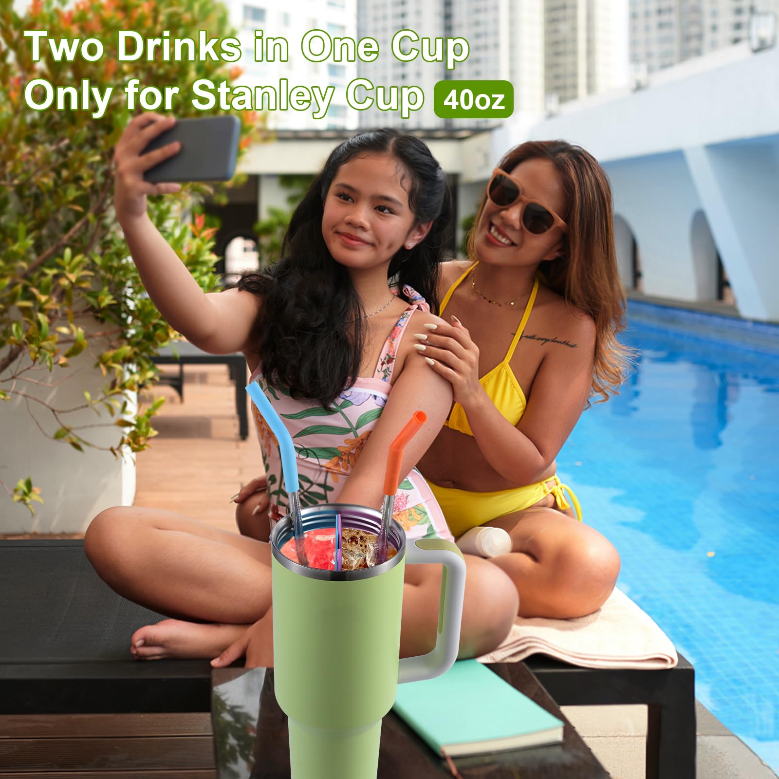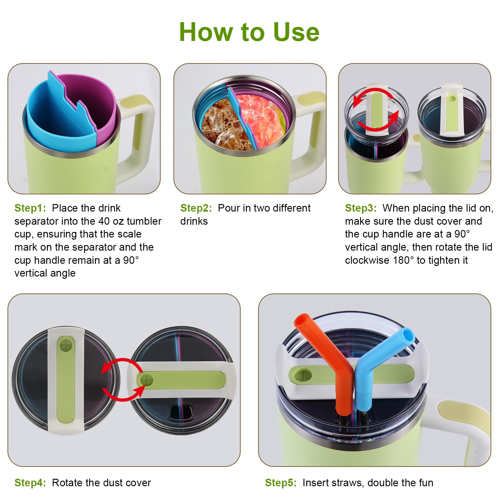 - 【Creative 2-in-1 Design】 This stanley cup divider 40 oz, layered design, you can pour two kinds of beverages, such as cola, juice, coffee or milk. Gives double experience, compartments do not skewer, free to switch, comfortable to drink, you can also use it to load snacks on one side and beverages on the other side, doubling your happiness.