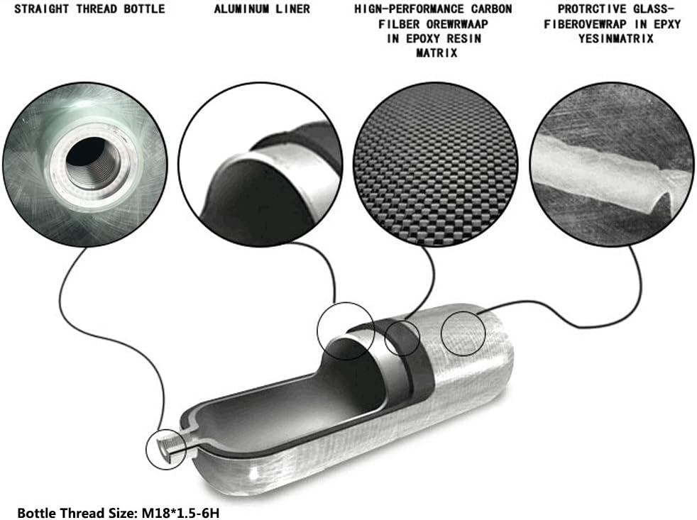 - Material: Imported AL-6061 aluminum alloy liner, carbon fiber and glass fiber winding bottle body.