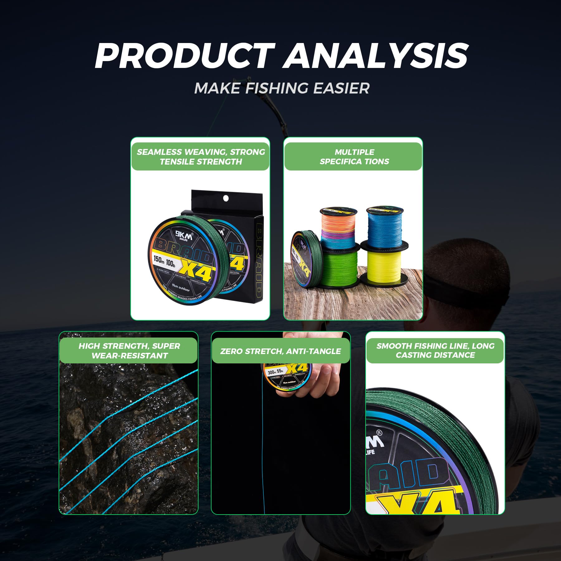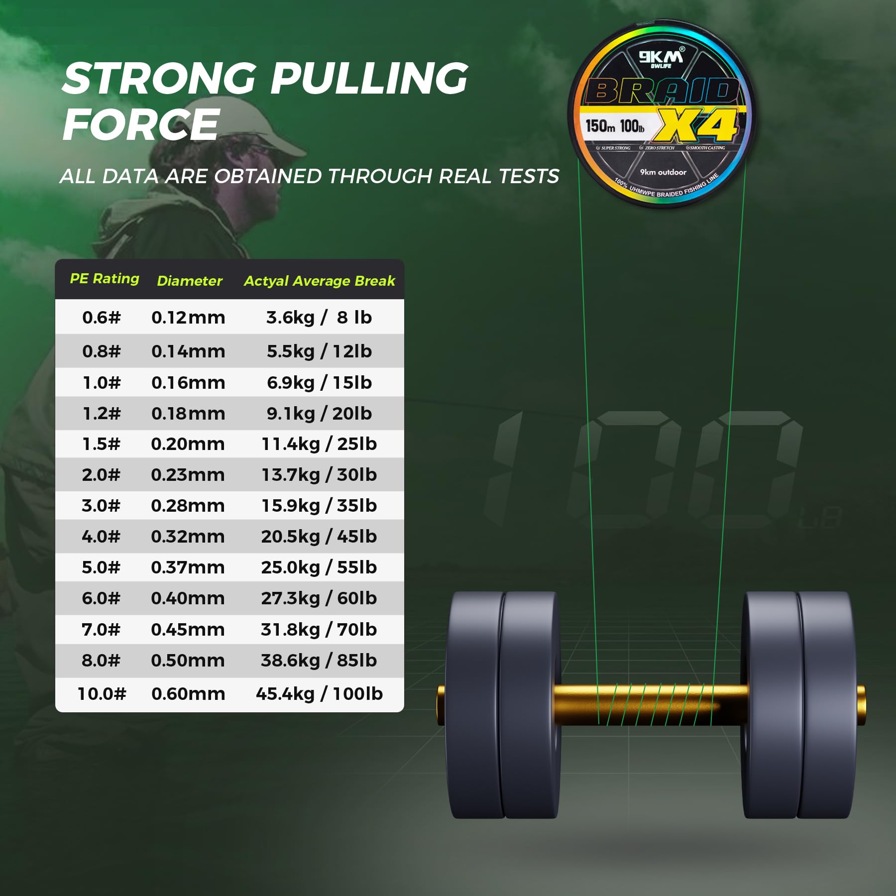 - 【Dyneema Fiber: 4X Stronger Than Steel】 Made from the world's strongest fiber and braided from 4 strands of fishing line, it is more abrasion resistant and stronger than monofilament fishing line.our braided line withstands sharp rocks and teeth. Perfect for battling big bass or saltwater predators!