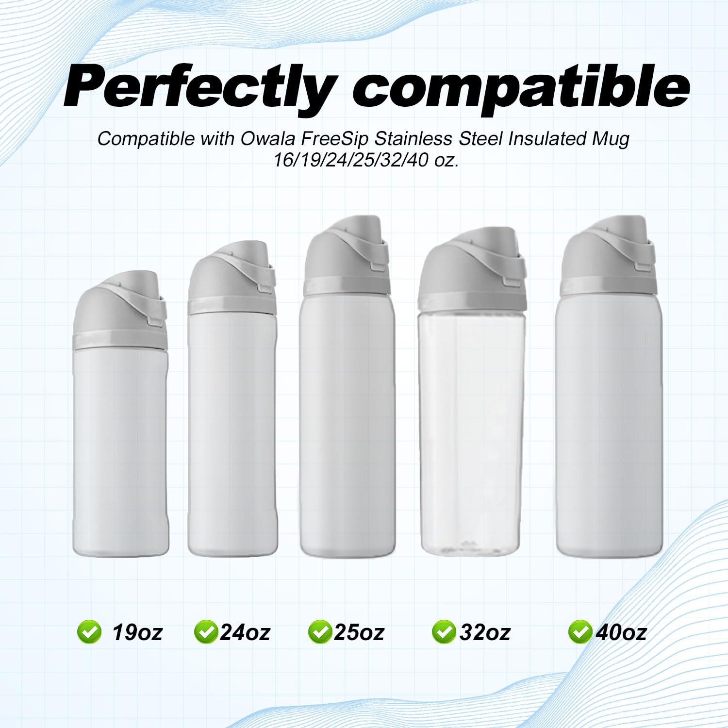 - Compatibility: Our products are specially designed for Owala 16/19/24/25/32/40oz stainless steel water bottle, Owala FreeSip 25oz, Owala FreeSip 25 oz Clear Tritan plastic water bottles. Not suitable for any other brands or sizes. Please confirm the size and brand before buying. Please note that our product is not sponsored or endorsed by, or affiliated with the brands it fits, including Owala FreeSip.