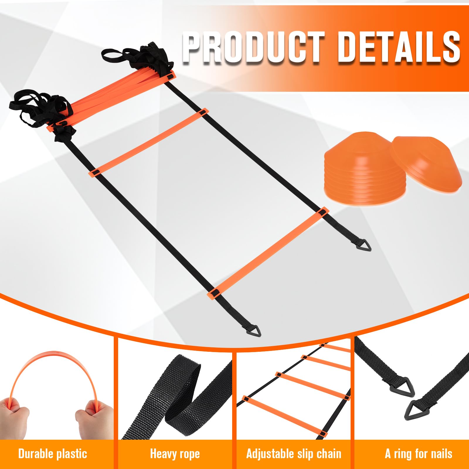 - Training Ladder for Footwork: This 20-foot agility ladder comes with 12 adjustable rungs, 4 stakes, and 10 premium sports cones to meet all your workout needs. Training ladder for footwork is perfect for both beginners and professional athletes
