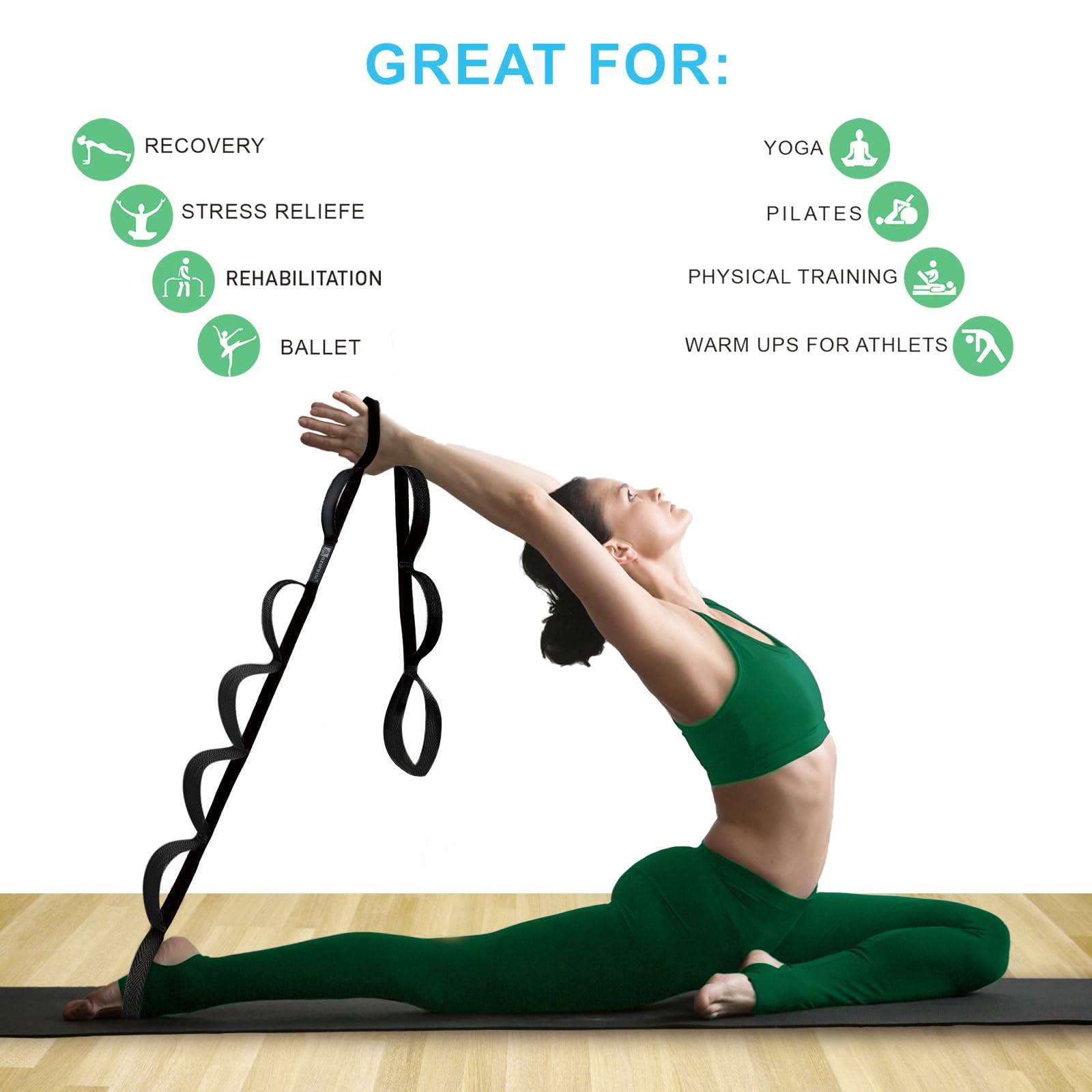 - One Premium Yoga strap, Length 76" / Width 1", 10 Non-elastic loops; Made of premium polyester fabrics webbing, Non-elastic, Eco-friendly dyeing, Tight-knit technique, Double lock seam. come with a simple illustrated workout guide with 9 exercises