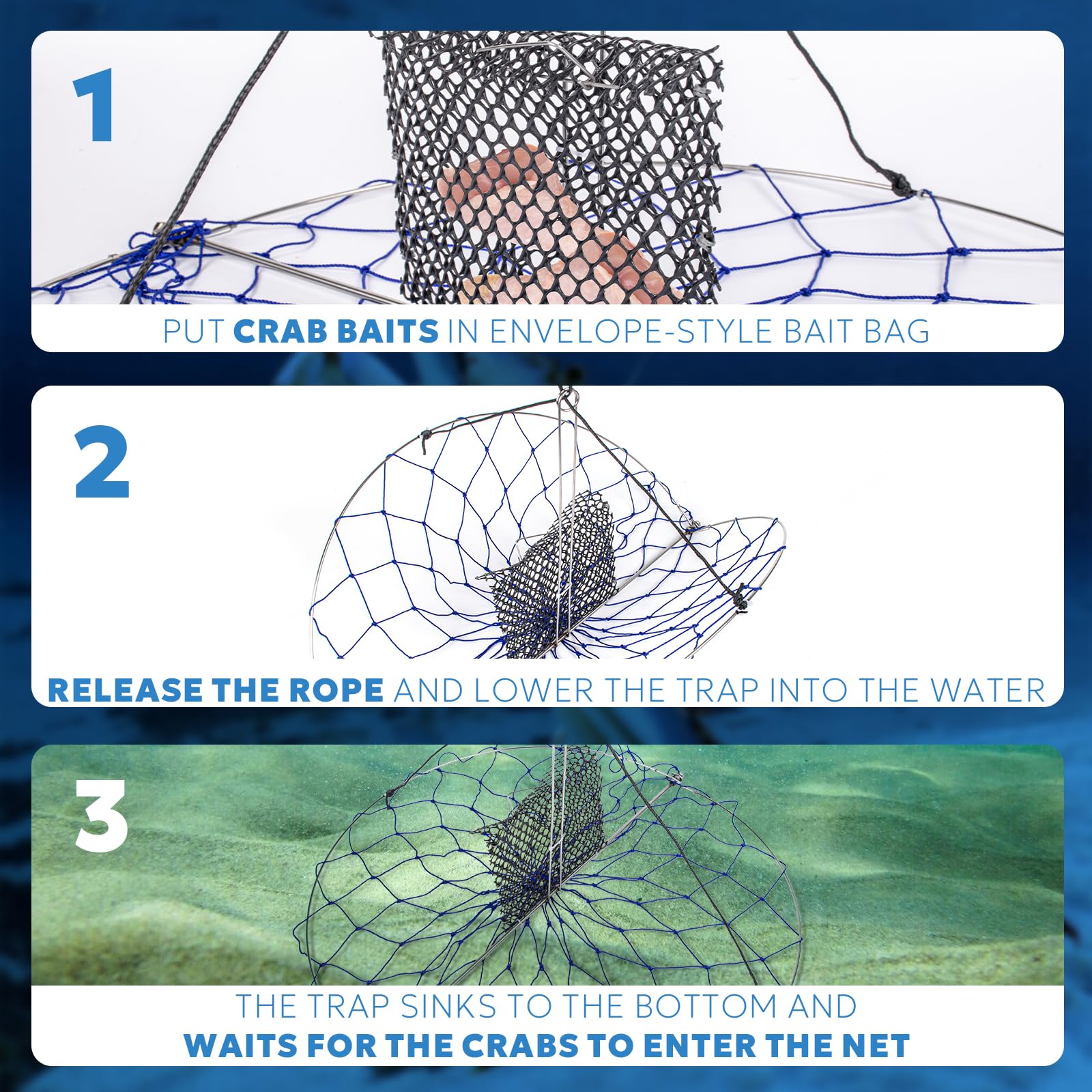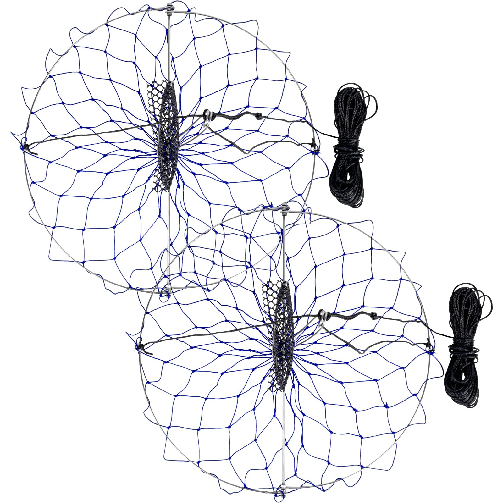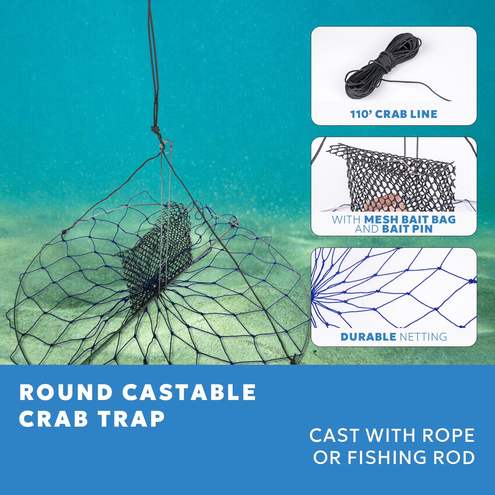 - Basic Information: Diameter: 24’’, blue trap net is equipped with 110’ crab line, mesh bait bag and bait pin, totally weighs 0.9lb.