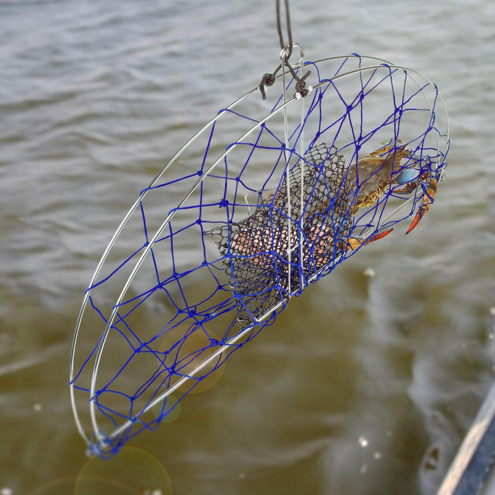- A1FISHER Round Castable Crab Trap features a stainless steel frame and heavy-duty nylon netting.