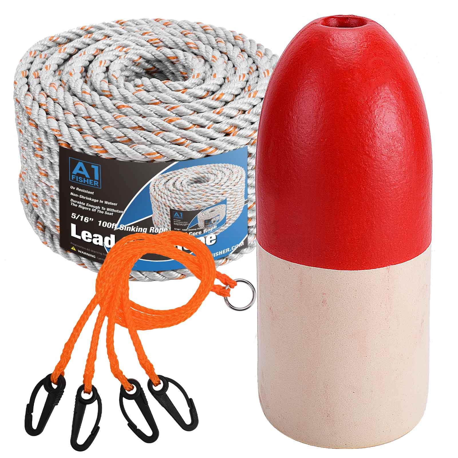 A1FISHER 5/16" Dia-100’ Leaded Core Rope with 13.8’’x5.9’’ Red/White Crab Trap Deep Water Float Buoy, 4 Arm Trap Harness Combo