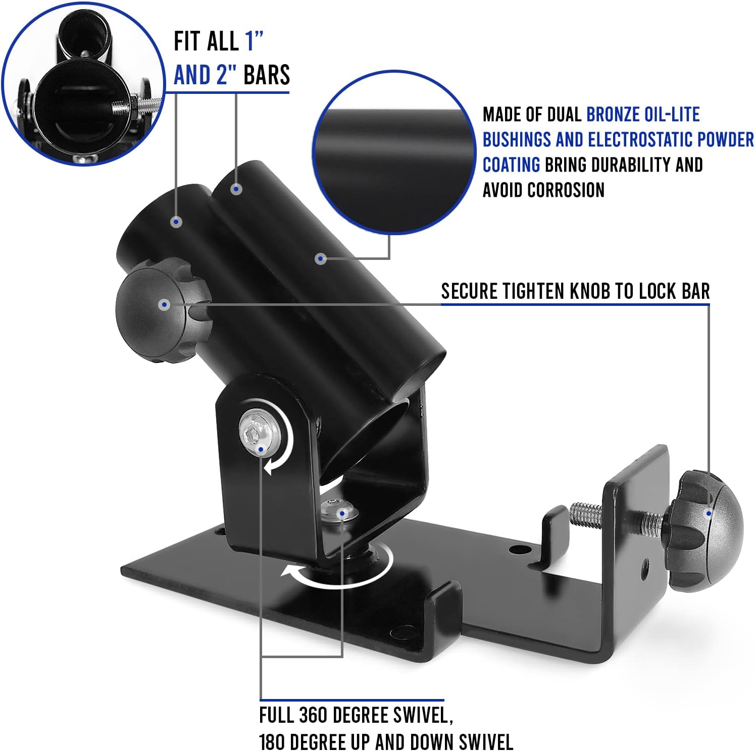 - Includes 2 bushings, with diameter 1” and 2” that can fit with any Standard and Olympic Bars respectively. Its highlight is the full 360 degree swivel and full range swivel up and down, so it give you multi-direction workout that impact on all the major muscles in your back, shoulder and the pulling muscles in your arms.