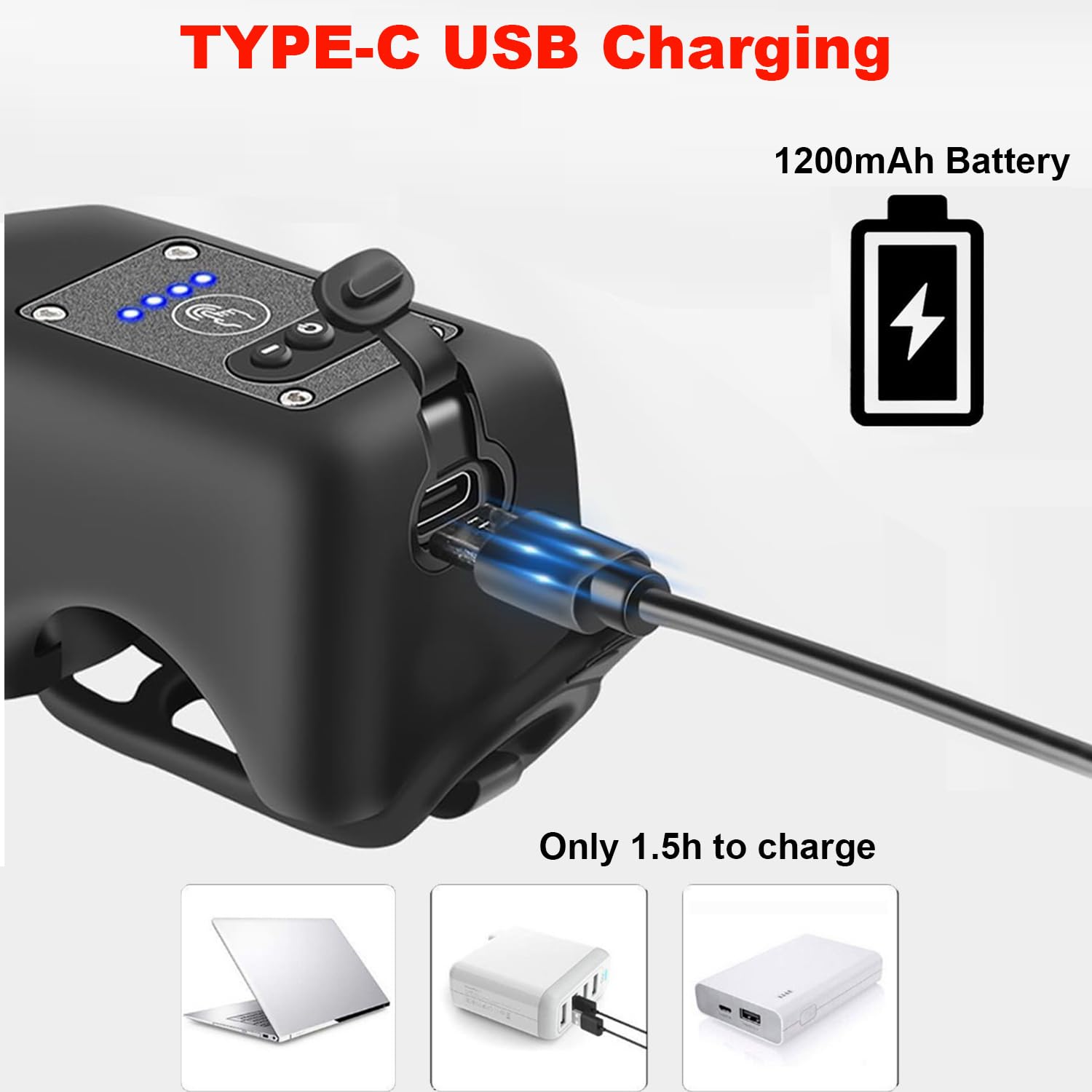 - 【USB Rechargeable and Water-Resistant】This electric bicycle horn for adults built in 1200Mah large-capacity lithium battery, supports TYPE-C fast charging, and can be fully charged in 1.5h, meeting your daily usage. IPX5 Waterproof performance, no worry about cycling in the rain.