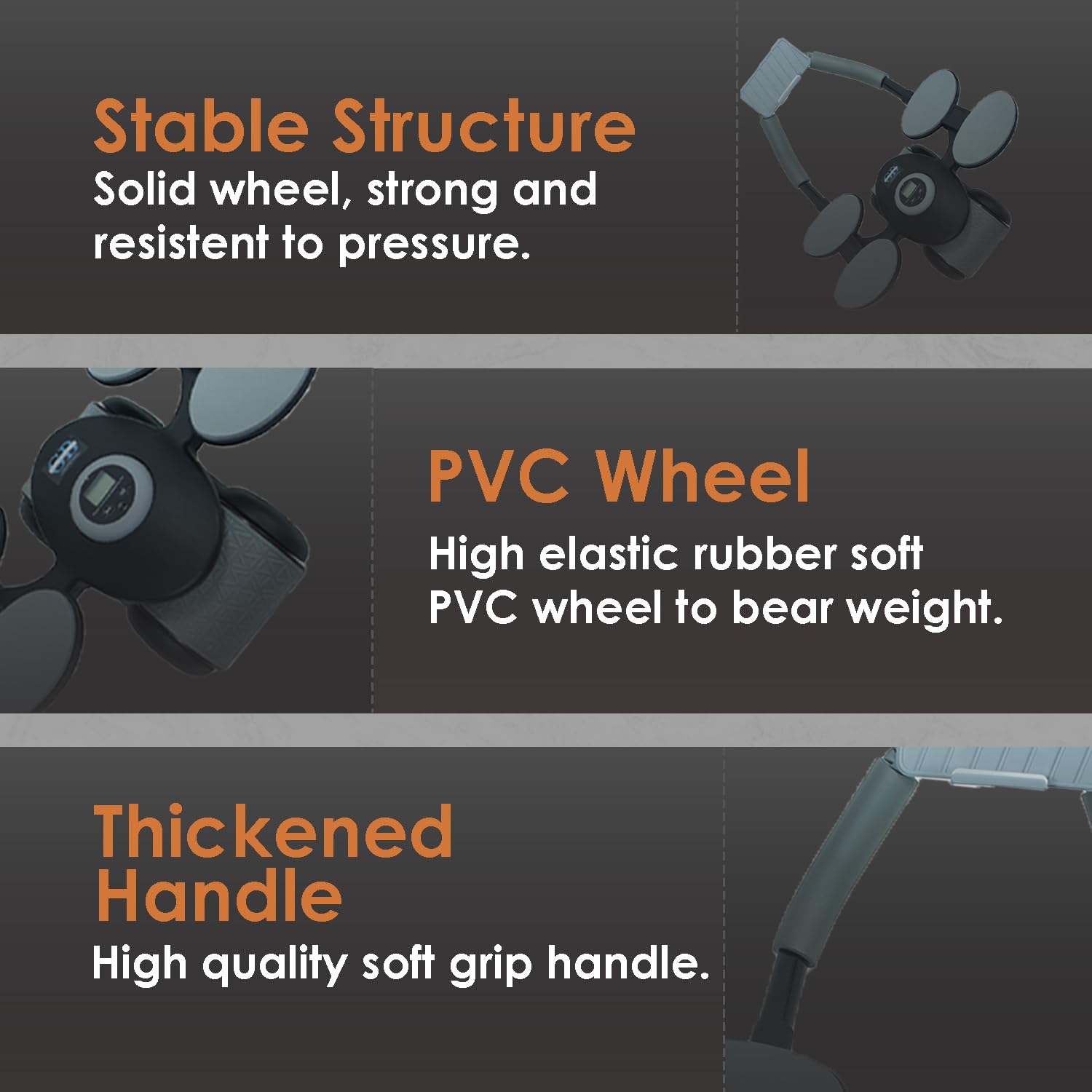 Our roller wheel features ergonomically designed handles with a non-slip surface, ensuring a comfortable grip even during intense workouts. The handles are contoured to fit your hands naturally, reducing strain and providing a firm, secure hold throughout your exercise. This reduces the risk of slipping or losing control during movement, helping you focus more on your workout rather than adjusting your grip. The anti-slip grip also minimizes the strain on your wrists, providing added comfort for longer sessions. Whether you're working out on hardwood floors, gym mats, or carpets, the secure grip ensures you maintain control of your ab roller. This attention to design allows you to focus on proper form and movement, which is essential for safe and effective core training.