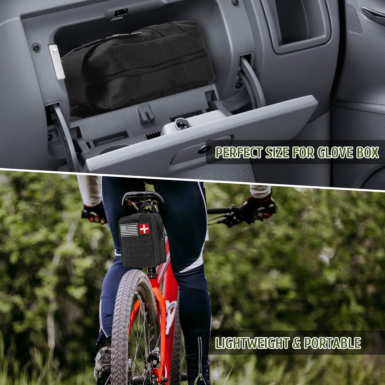 - 【Compatible and Portable】 The military grade MOLLE medical pouch is made of 1000D nylon, which is lightweight and waterproof. Inside the bag, there are three large compartments and several straps, all survival gear and equipment are stored in an organized and easy-to-find manner, making it easy to locate necessary items in an emergency situation. The MOLLE system on the back also allows you to easily attach the kit to your tactical vest, backpack, or belt.