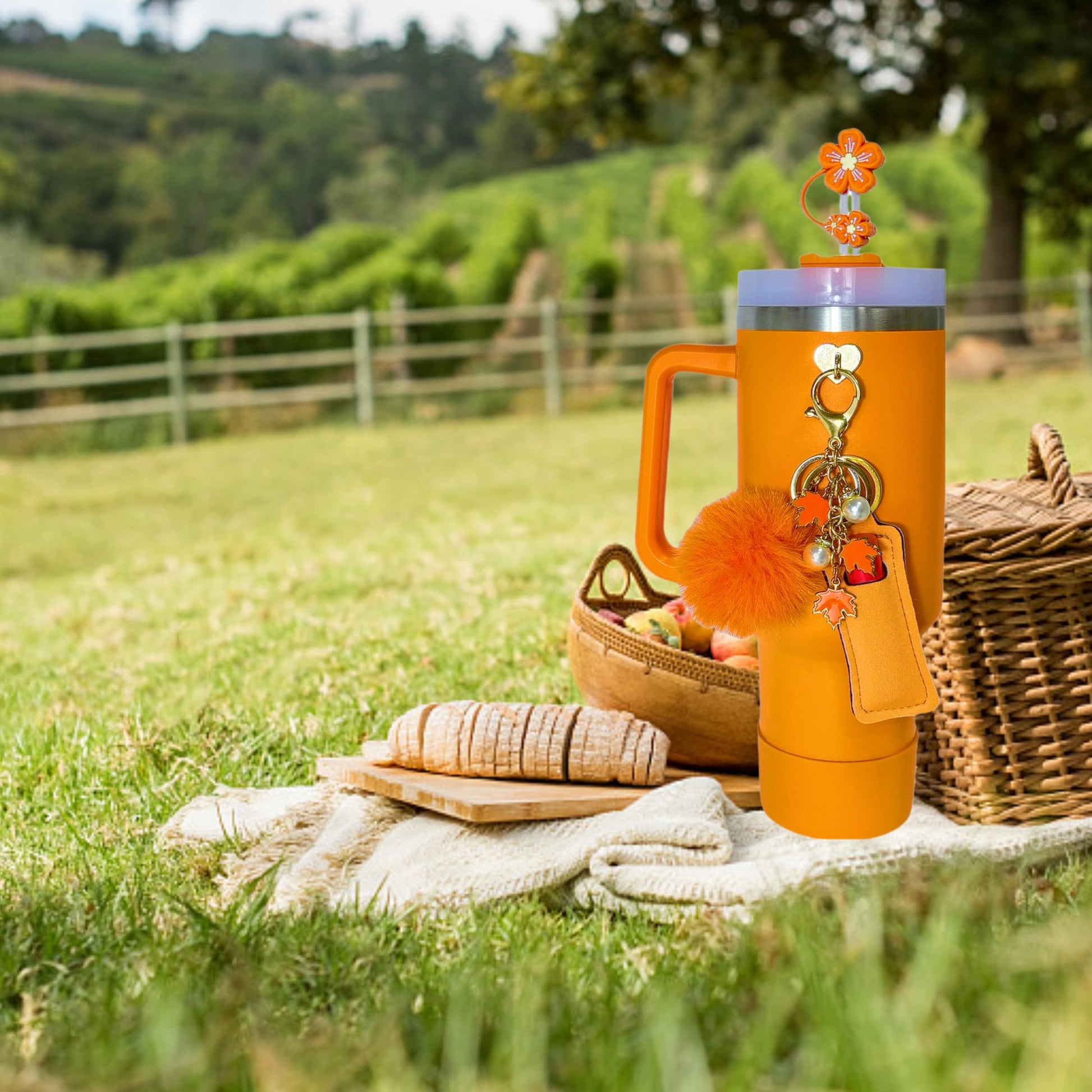 Accessories for Stanley Cup 40oz,2 Silicone Boots for Stanley Tumbler,1 Flower Straw Cover Topper,2 Charms Hooks,1 Lipstick Holder Bag,1 Pompom Ball,1 Cute Keychain Charm(Orange,No Bottle)