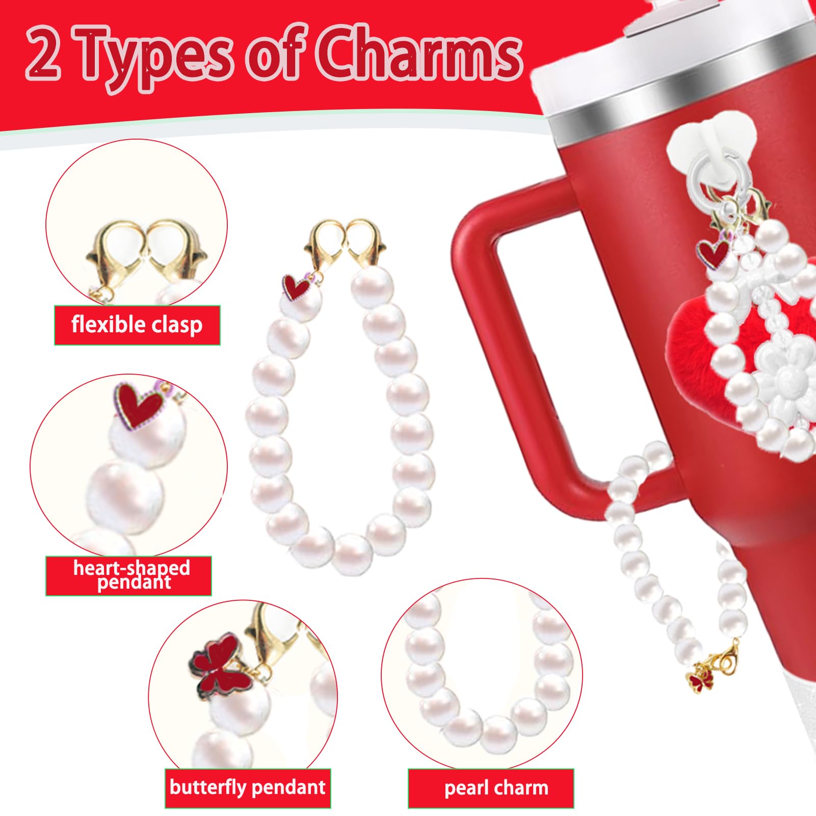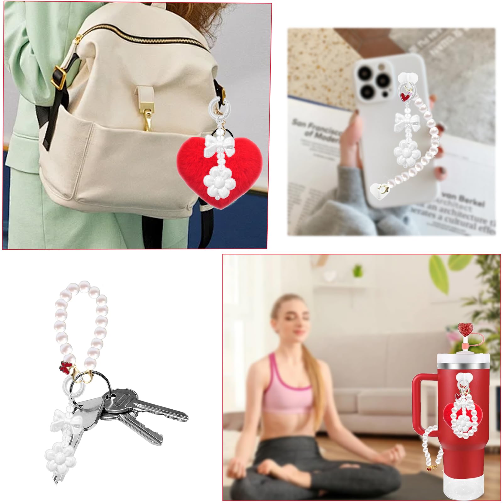 - Dazzling & Charming Cup Accessory Set:Including 1 pcs siliocne straw cover,1 pcs siliocne stanley cup boot,2pcs heart hook.1pcs pompom ball,2pcs pearl chain,1pcs flower key-chain