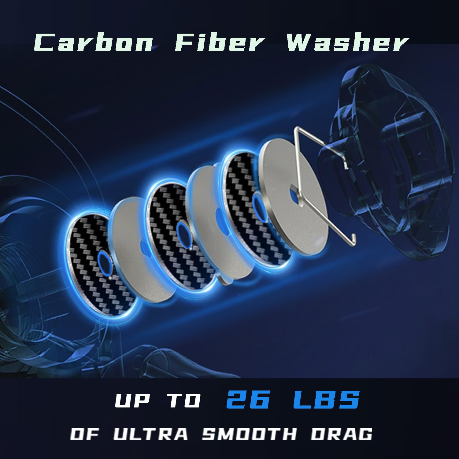 - Carbon Fiber Front Drag System - Up to 26 LBs reliable triple disc carbon fiber drag, which will exhaust the fish without wearing you down