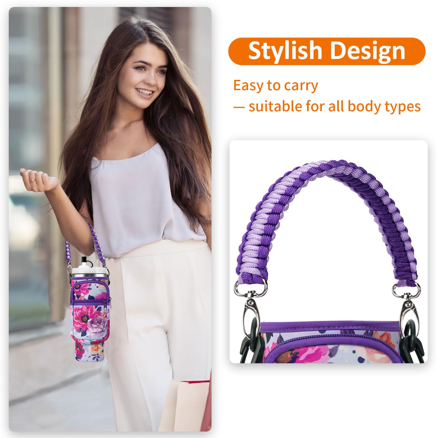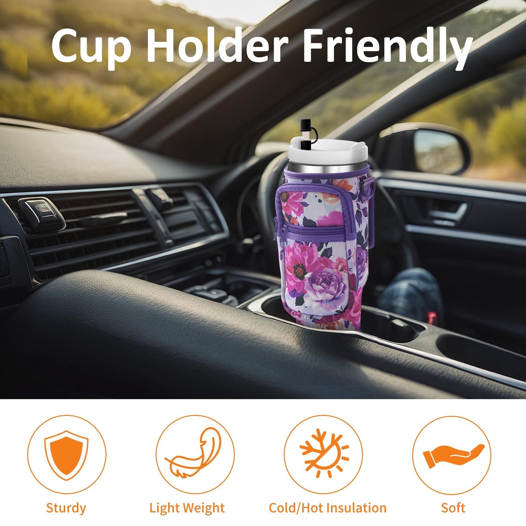 AceTreker 40 oz Stanley Tumbler Sleeve Bag with Paracord Handle & Straw Cap, Neoprene Vacuum Insulated Travel Mug Carrier Pouch with 2 Pockets & Shoulder Strap for Car Home Work-Purple Rose