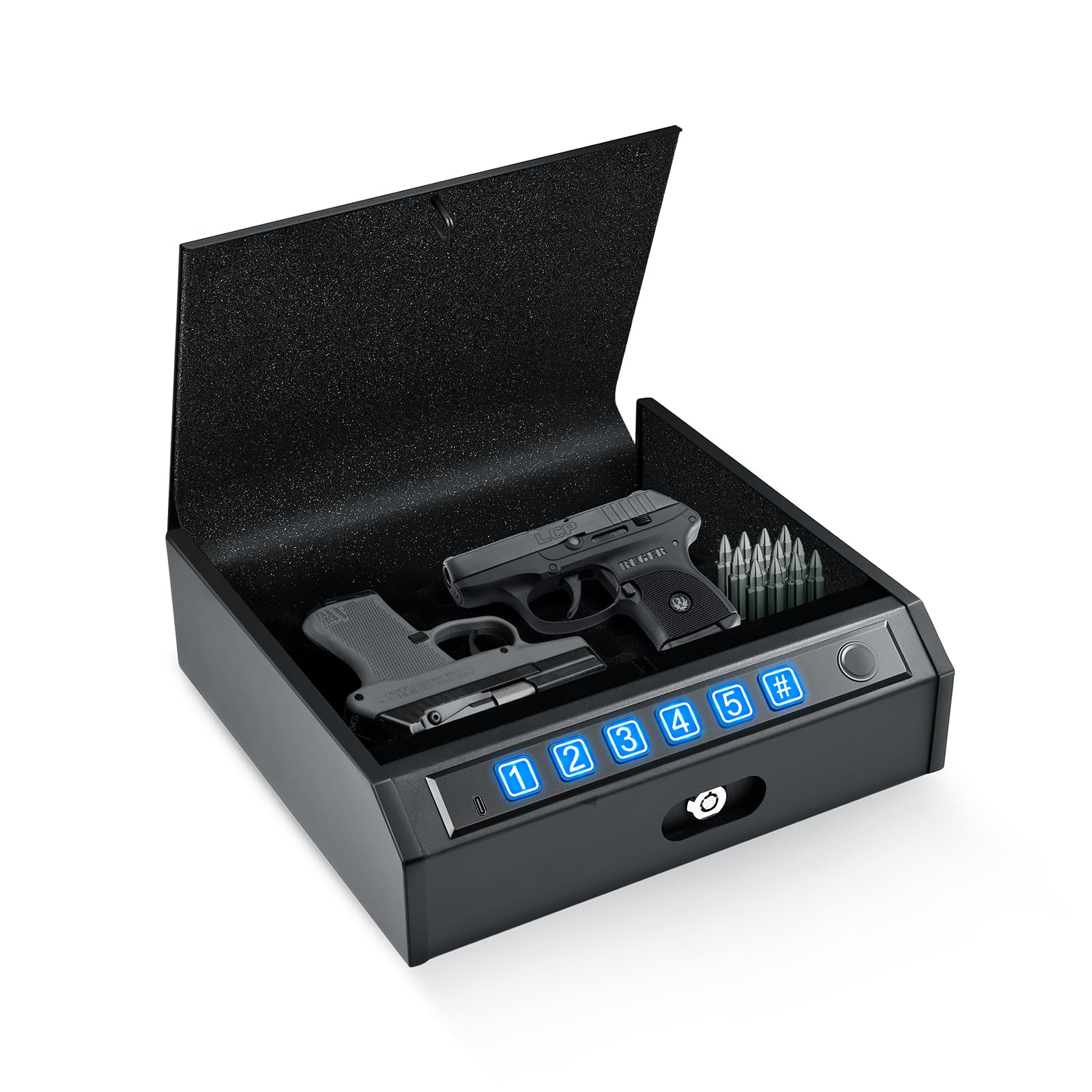 - The ADIMO handgun safe is equipped with a built-in USB power port that provides temporary power when batteries fail or keys are unavailable—ensuring access in emergencies. This port does not recharge the battery.