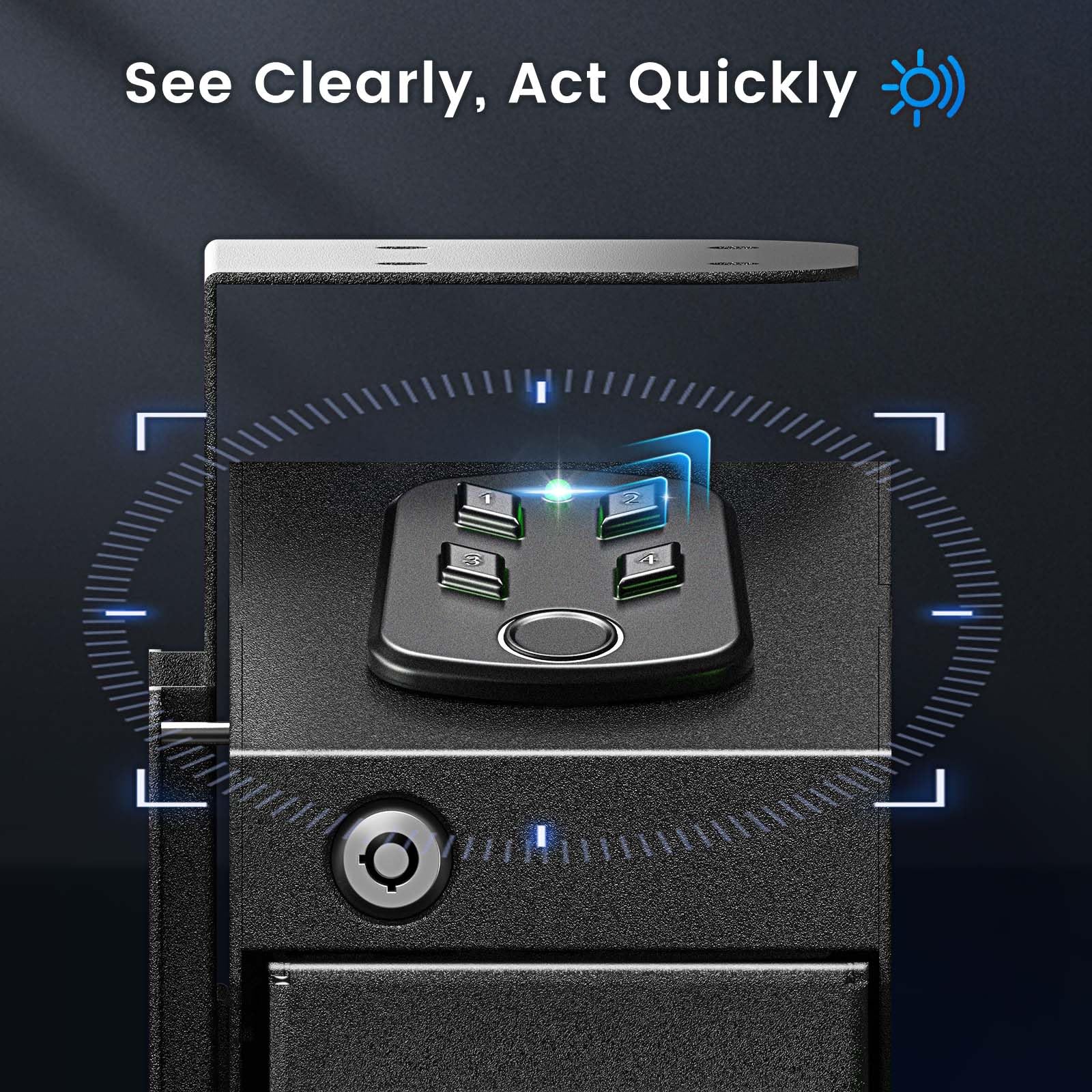 - 【LED Light & Silent Mode】Lights inside the gun safe help you access your firearms in dim light. In standby mode, long press "key 4" for more than 2S until the buzzer "beeps" (if the sound is on), and the green light flashes once to turn on/off the sound.