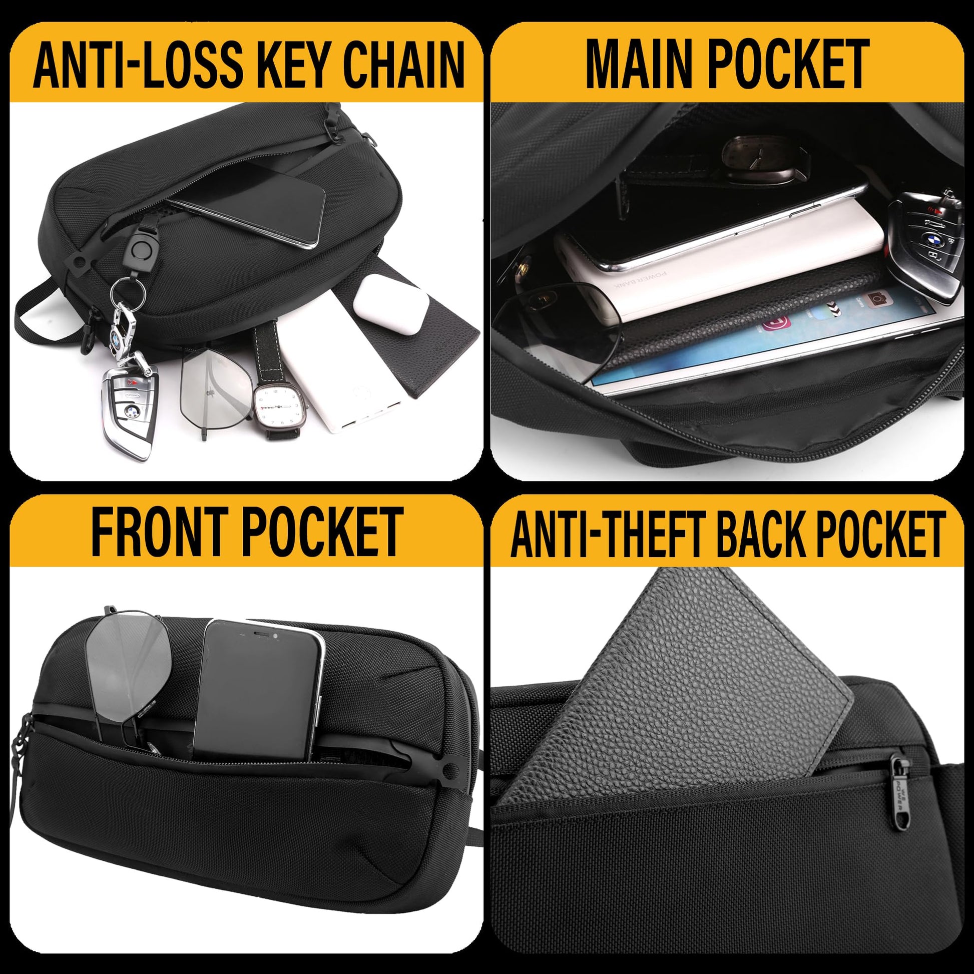 - Multi-functional Storage: Features three compartments. Quick access front pocket is designed with an anti-lost keychain, and can also quickly organise AirPods Pro, credit cards; Multiple internal pockets in the middle for tech devices, such as Switch, Kindle, Power Bank, cable etc. ; Theft-proof hidden zippered pocket on the back side is great for you to keep your valuables away from the thieves. The large size offers ample space on the go, ideal for more extensive use.