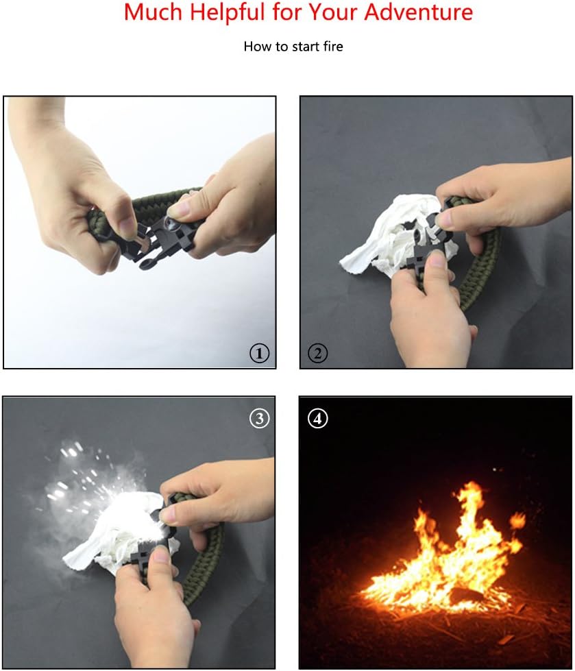 - 550 Grade Paracord: The bracelet can be disassembled to a 3.2m long rope wit a diameter of 4mm, and it can support up to 550 pounds which giving you better safety guarantee when in wild, you can use it to stop bleeding, making traps, bundling temporary tents, hammocks, hang heavy objects and more