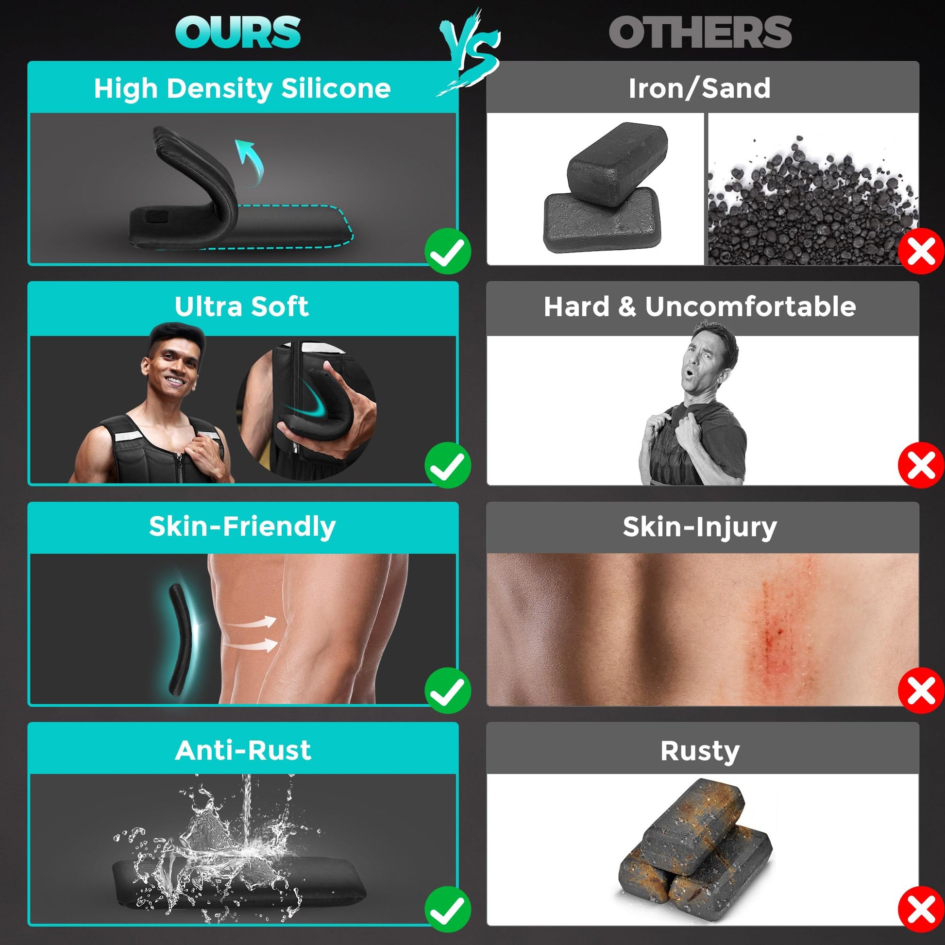 - PREMIUM SILICONE WEIGHTS - Others weight block use iron/sand which are hard and get rusty easily, it may lead to skin injury. Ours uses high density silicone which is ultra soft and flexible. It is skin-friendly and anti-rust, give you a better workout experience