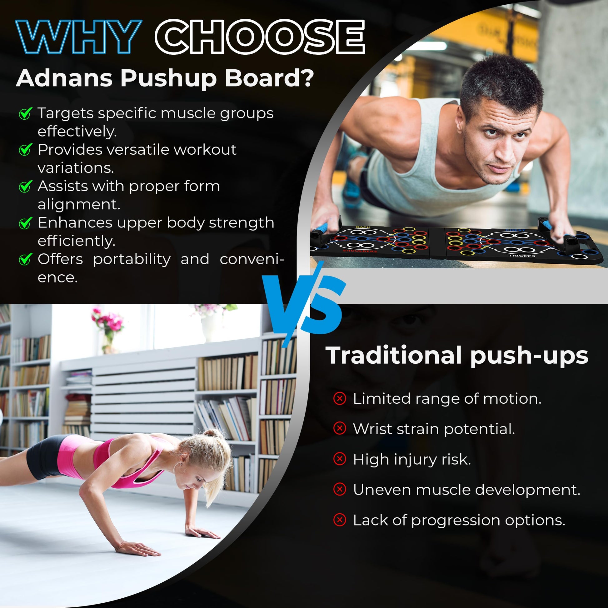 - MAXIMUM RESULT - Adnan's Color coded Portable Gym for perfect pushup targets different muscle groups (chest, shoulder, triceps, biceps, and back), engaging your core. Scientifically proven for 30% to 50% more muscle activation. The push up bars Includes detailed instructions and professional training guide for a full body workout.