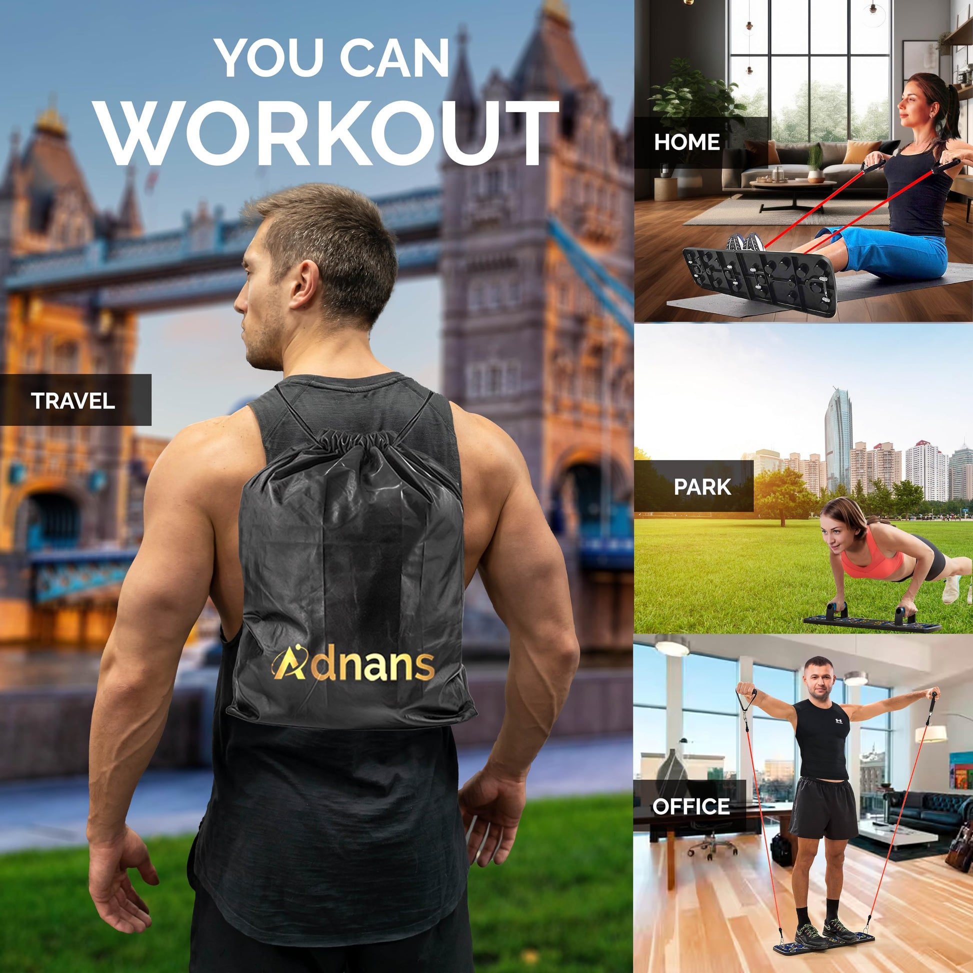 - MULTIPURPOSE - Our Calisthenics equipment is a combination of Pushup board with Resistance bands for working out, Jump rope for men and women, Door anchor for resistance bands, non-slip pads and drawstring bag which can fulfill most of your workout needs in the Gym. Elevate your strength training right at the comfort of your home.