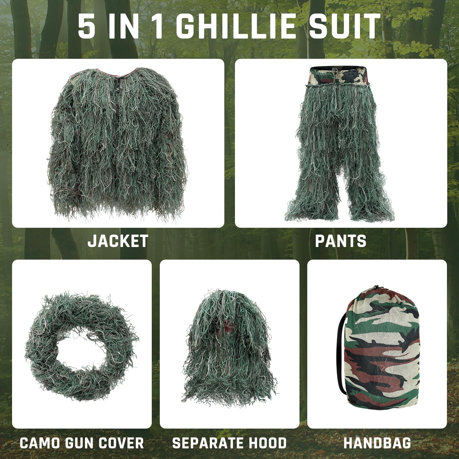 - Package Includes:Our Pack of 5 in 1 Ghillie Suit includes a hood, jacket, pants, gun wrap, and stuff sack, making it portable and easy to carry.