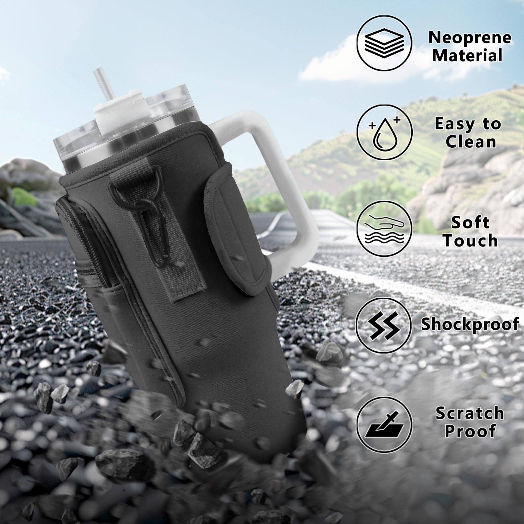 - đ ăPremium MaterialsăAre you still worried about your tumbler being scratched or broken? Water bottle pouch is made of premium neoprene, soft, lightweight, durable, no odor, providing excellent water resistance and shock protection.The water bottle bag can protect your cup from collisions and scratches, and will not make any noise when placed on the table. Thoughtful gifts for Stanley Fans.
