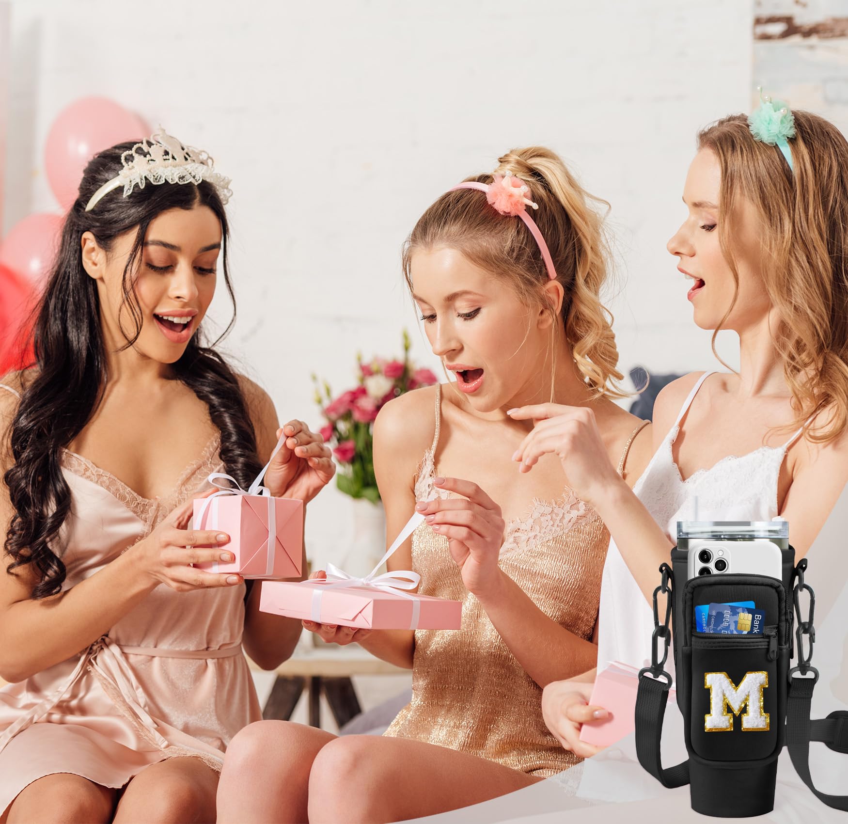 Aganmi Mothers Day Birthday Gifts for Mom Teacher Water Bottle Carrier Bag with Phone Pocket for Stanley 40oz Tumbler Initial Water Bottle Holder with Adjustable Strap for Women Hike Camping Black A