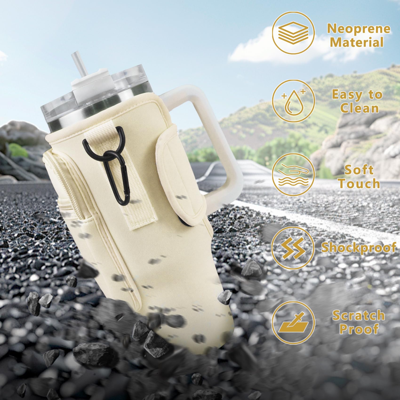 - đ ăPremium MaterialsăAre you still worried about your tumbler being scratched or broken? Water bottle pouch is made of premium neoprene, soft, lightweight, durable, no odor, providing excellent water resistance and shock protection.The water bottle bag can protect your cup from collisions and scratches, and will not make any noise when placed on the table. Thoughtful gifts for Stanley Fans.