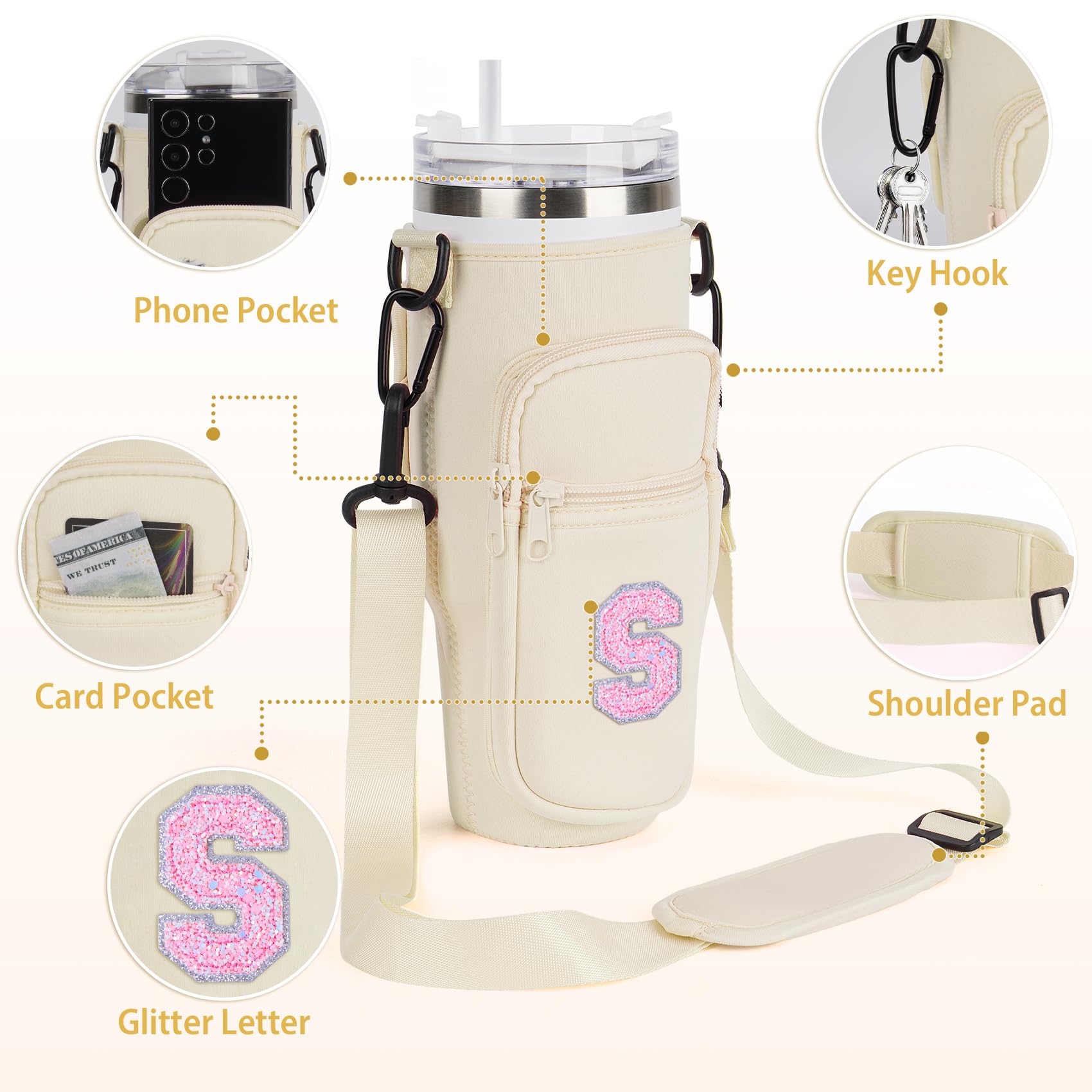 Aganmi Water Bottle Carrier Bag with Phone Pocket for Stanley 40oz Tumbler,Glitter Initial Sport Water Bottle Holder Sling Pouch with Adjustable Strap for Stanley Cup Accessories (Cream A)