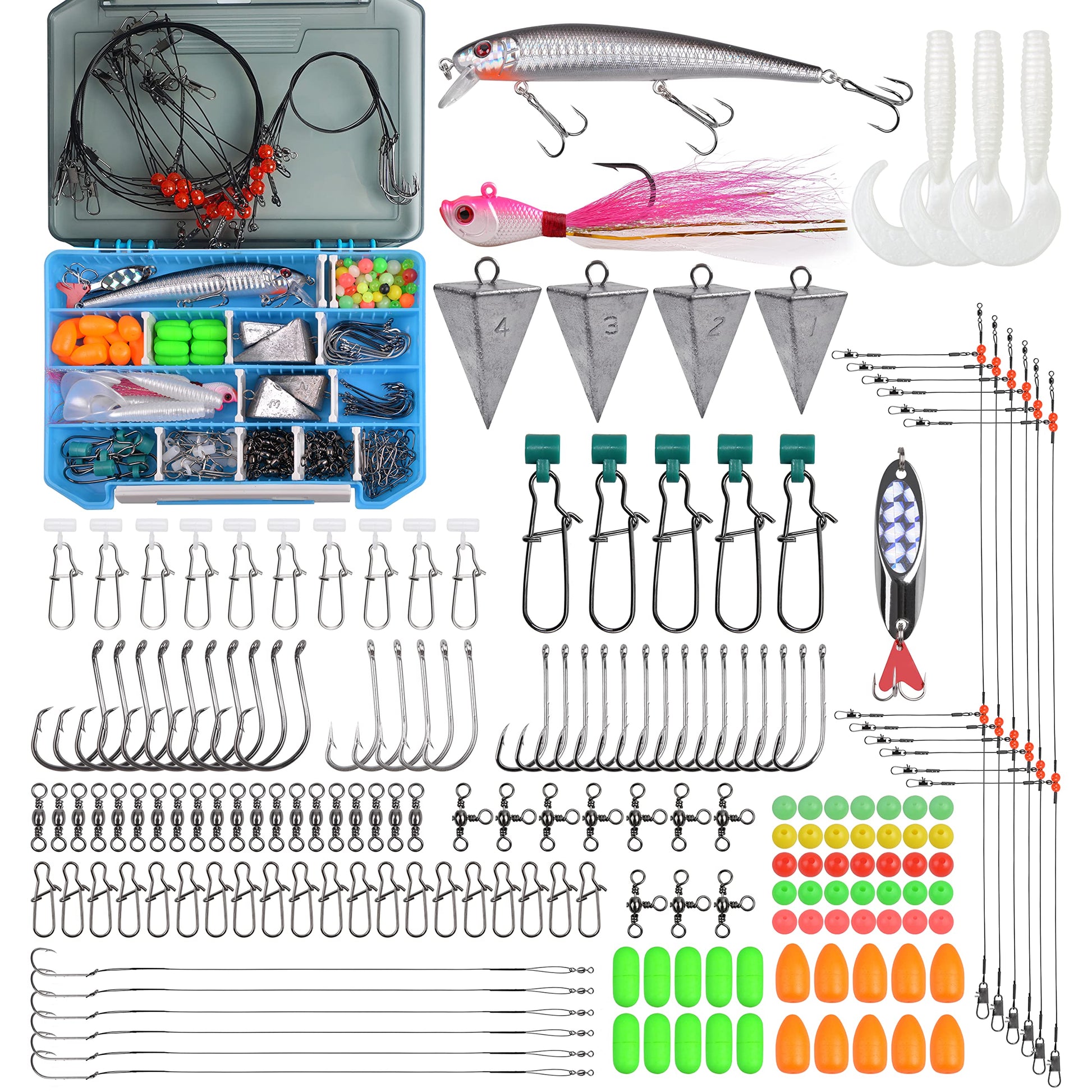 - 【173pcs Tackle Kit】Saltwater fishing lure*1, Bucktail Jig*1, Casting Spoon*1, Rig Floats*20, Pyramid Sinker*4, Wire Leader*6, Bottom Rig*6, Hooks*30, Barrel Swivels*20, Snap*20, Three Way Swivel*10, Sinker Sliders*15, Fishing Worm*3, Beads*35,Tackle Box*1