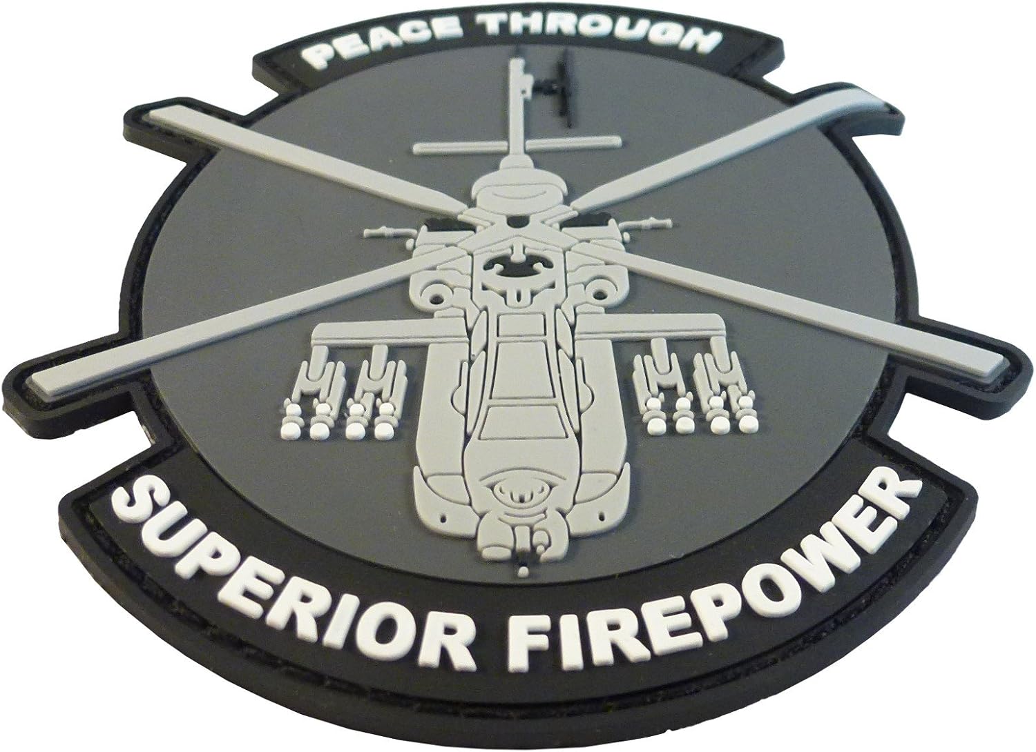 - Embrace the spirit of tactical excellence with the AH-64 Apache Helicopter patch. Bearing the assertive motto 'Peace Through Superior Firepower,' it's ideal for mi1itary fans and professionals. This patch symbolizes strength and dedication, ensuring it stands out as a vital part of your collection.