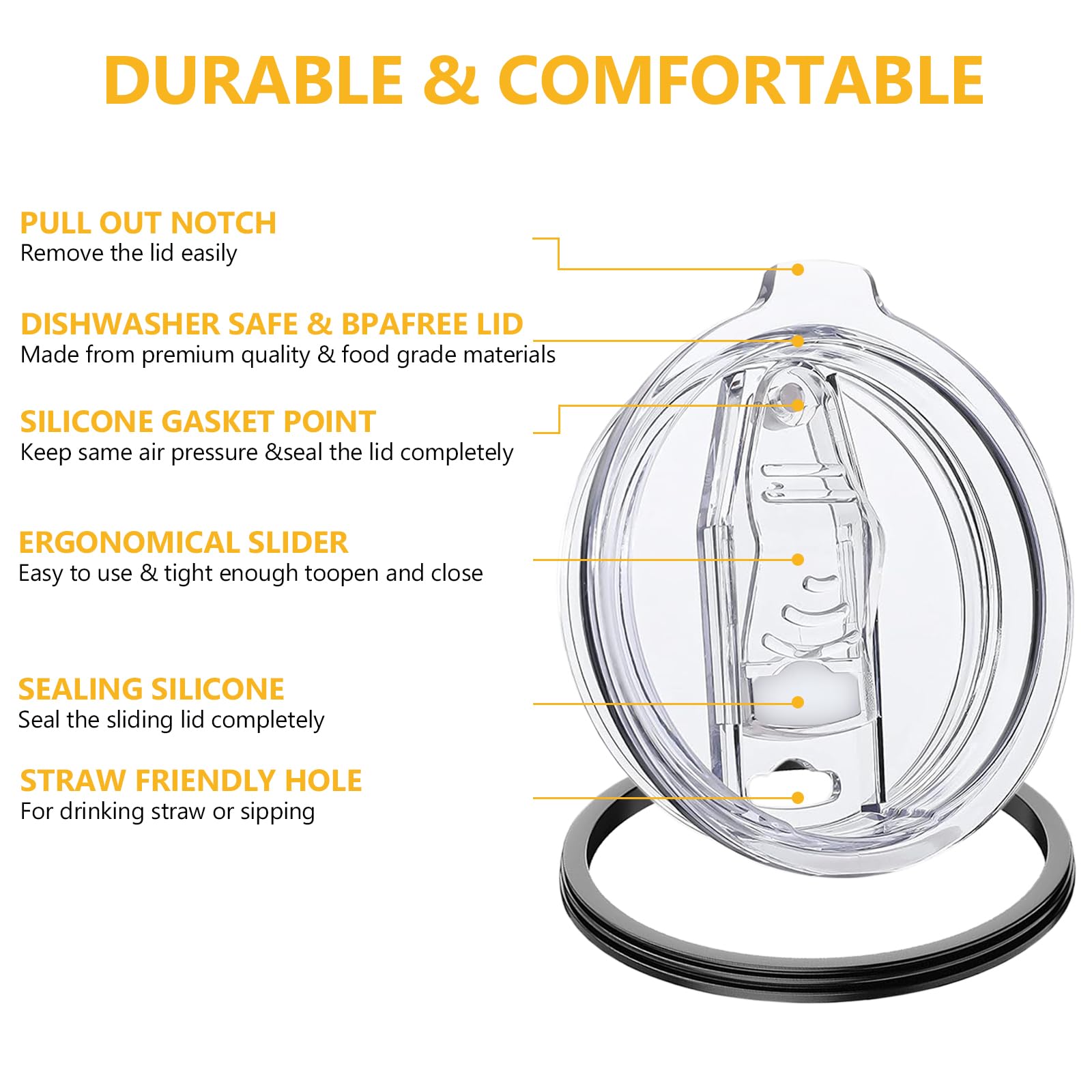 - DESIGN:Our lids are made of high quality material with on/off sliding lid design, easy to use.The hole at the top of the cup can be used directly or with a straw.The sliding lid design prevents you from touching your nose while drinking.It is very durable.