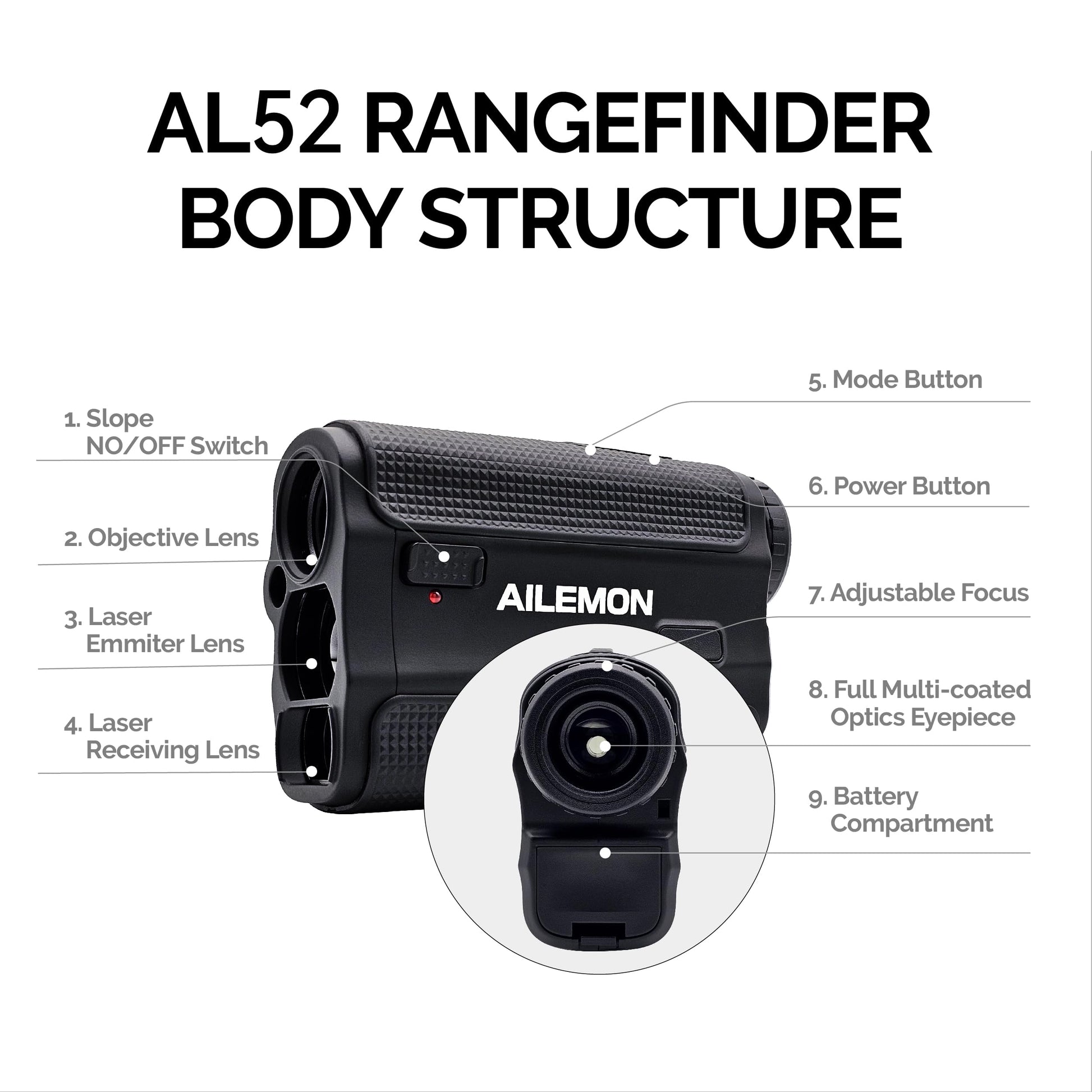 - IDEAL GIFT CHOICE: This AILEMON AL52 Rangefinder equipped with the most advanced laser rangefinder technology, solid construction, ergonomics design and lightweight size for each user, suitable for target shooting, gun hunting, bow hunting and golfing. Long press the “M” button to change the unit of measurement, and uses 2 regular AAA batteries(Not Included).