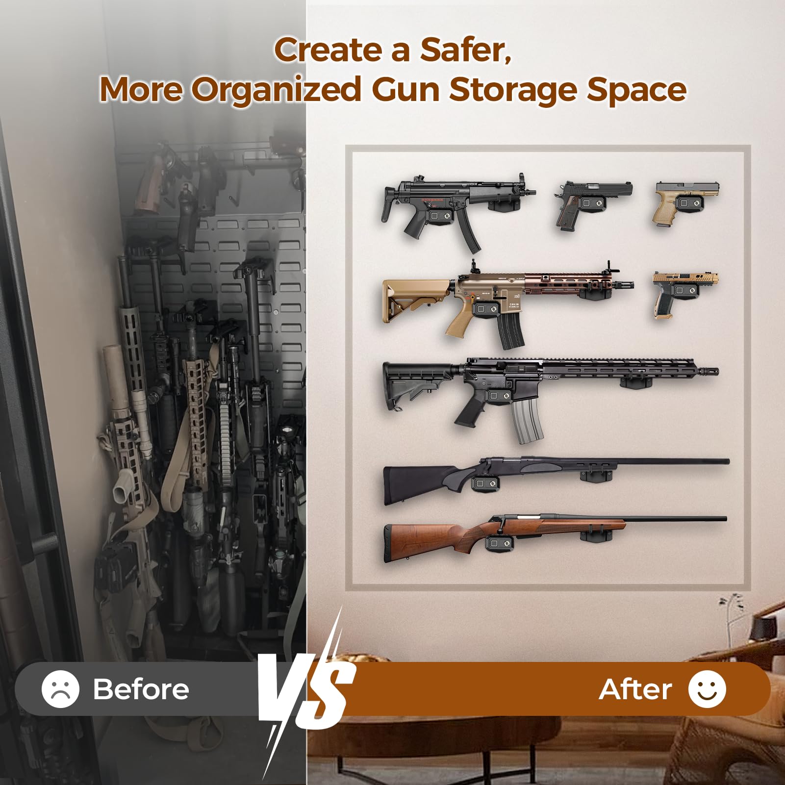 - Adaptable for Various Guns and Places: The wall gun rack for most guns like Rifles, Shotguns, and Pistols. Such as MK18, M870, AK47, AR15, SP5K, P226. You can securely hang your firearm anywhere with confidence—whether it's on walls, doors, cabinets, in your car, or at gun stores. You can also choose to install it in a hidden space for optimal camouflage