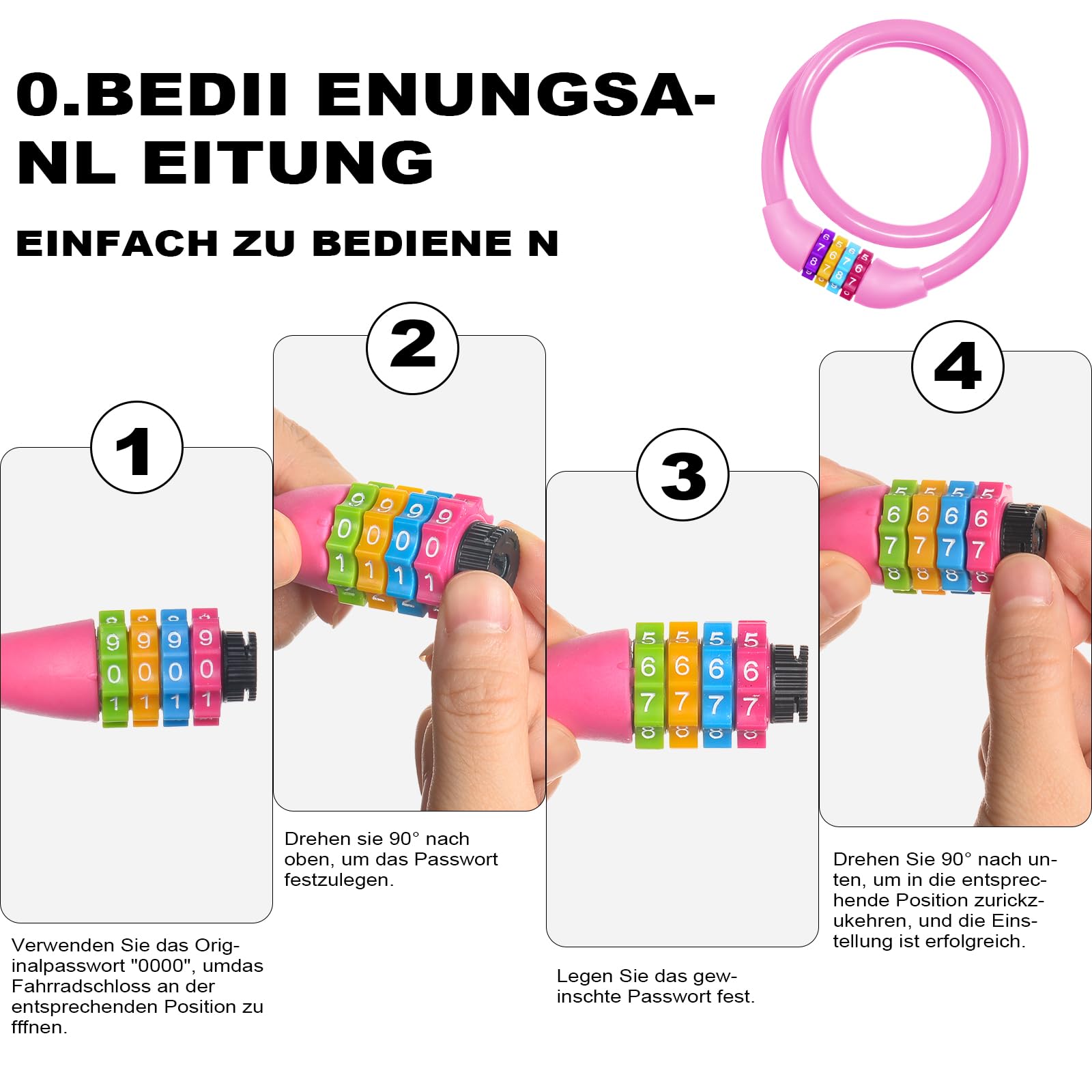 - 【HIGH SECURITY LEVEL PASSWORD LOCK】The bicycle lock password lock cable lock is equipped with a four-digit password lock. The default password is 0000, and 10,000 different combination passwords can be set to improve the safety of the bicycle lock. 4 smooth-running and sturdy number wheels that are kid-friendly and make changing codes quick and easy