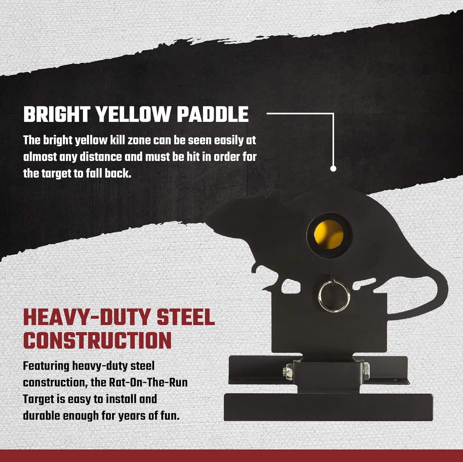 Test your rat shooting skills with this fun, exceptionally sturdy resetting target! The bright yellow kill zone can be seen easily at almost any distance and must be hit in order for the target to fall back. Once you have succeeded at hitting the kill zone, simply pull the 60-meter reset cord to pull the target upright and shoot again! Comes with two attached kill zone reducers to increase the challenge.