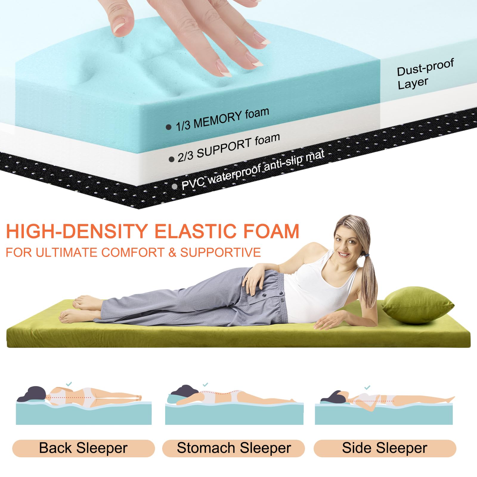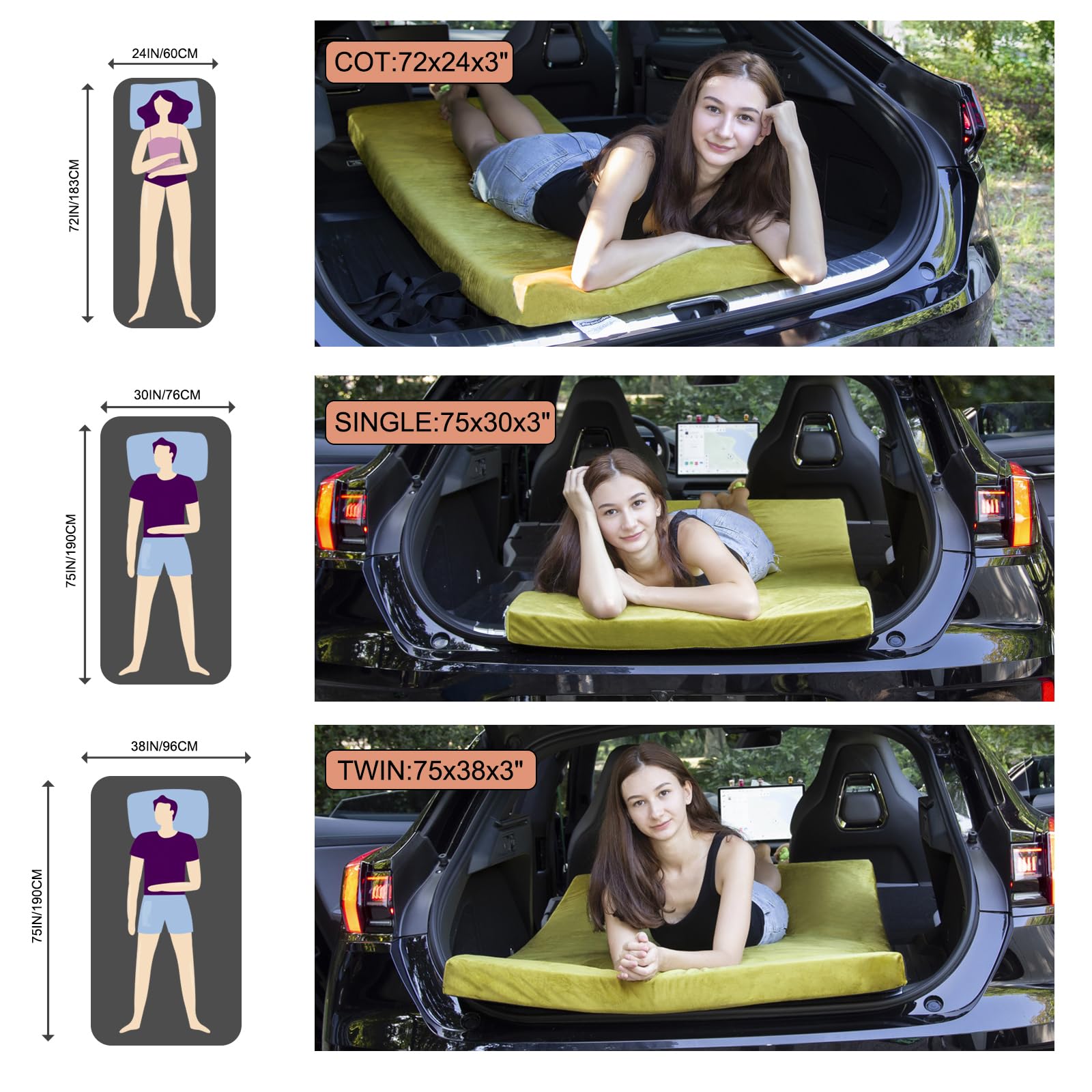 - Portable Comfort: Travel bag and pillow included. This portable mattress comes with two straps for easy roll-up or fold-out, fitting compactly into the included travel bag, which saves space and is easy to carry, it includes a pillow for added comfort. Available in multiple sizes (Cot: 72x24x3”, Single: 75x30x3”, Twin: 75x38x3”), it caters to various needs and preferences, making it an excellent choice for any sleeping arrangement