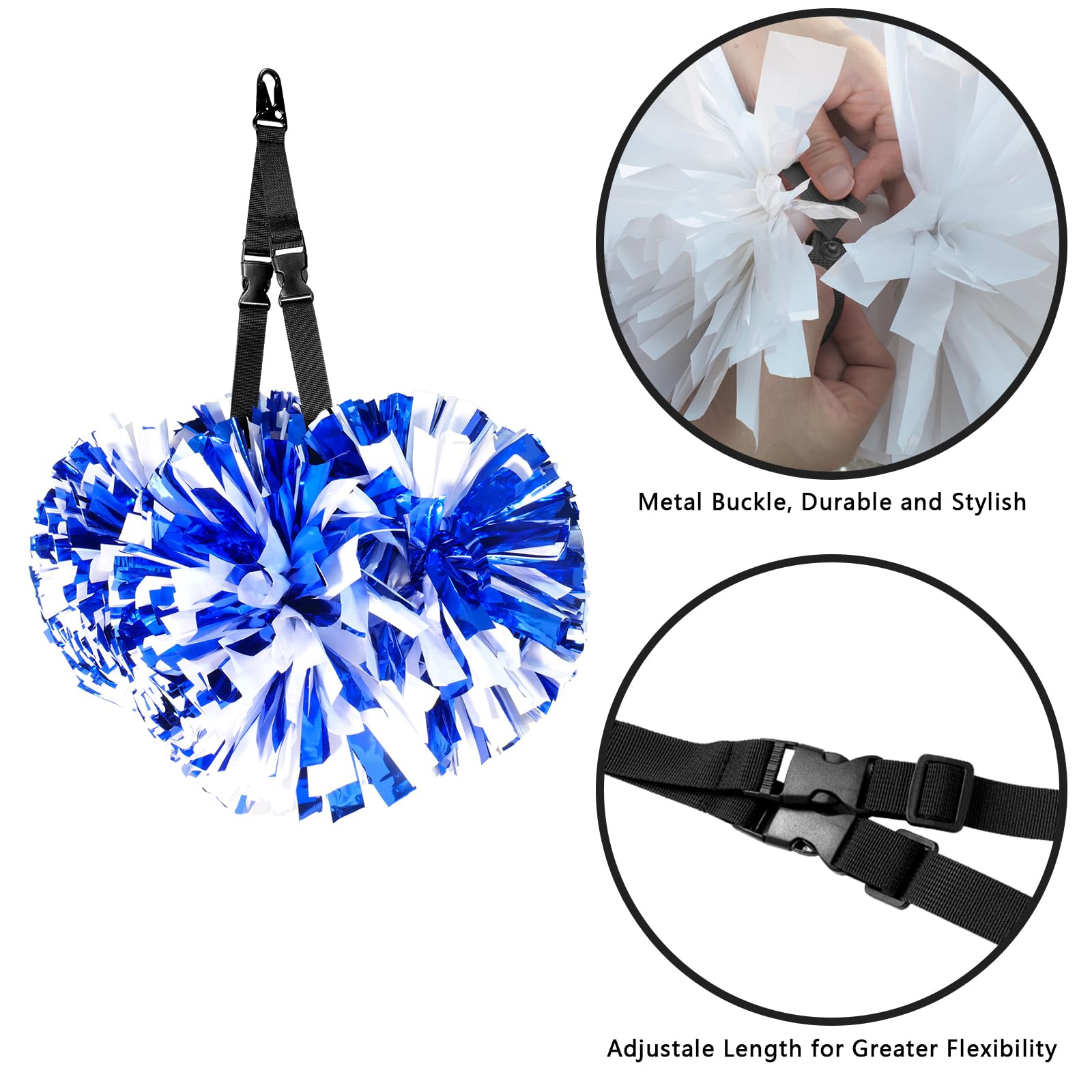 - 【Protect Your Cheer Pom Poms】Our specially designed pom pom holder, crafted with a combination of webbing, carabiners, adjustable buckles, and snap fasteners, ensures your cheer pom poms are stored securely and maintain their perfect shape.