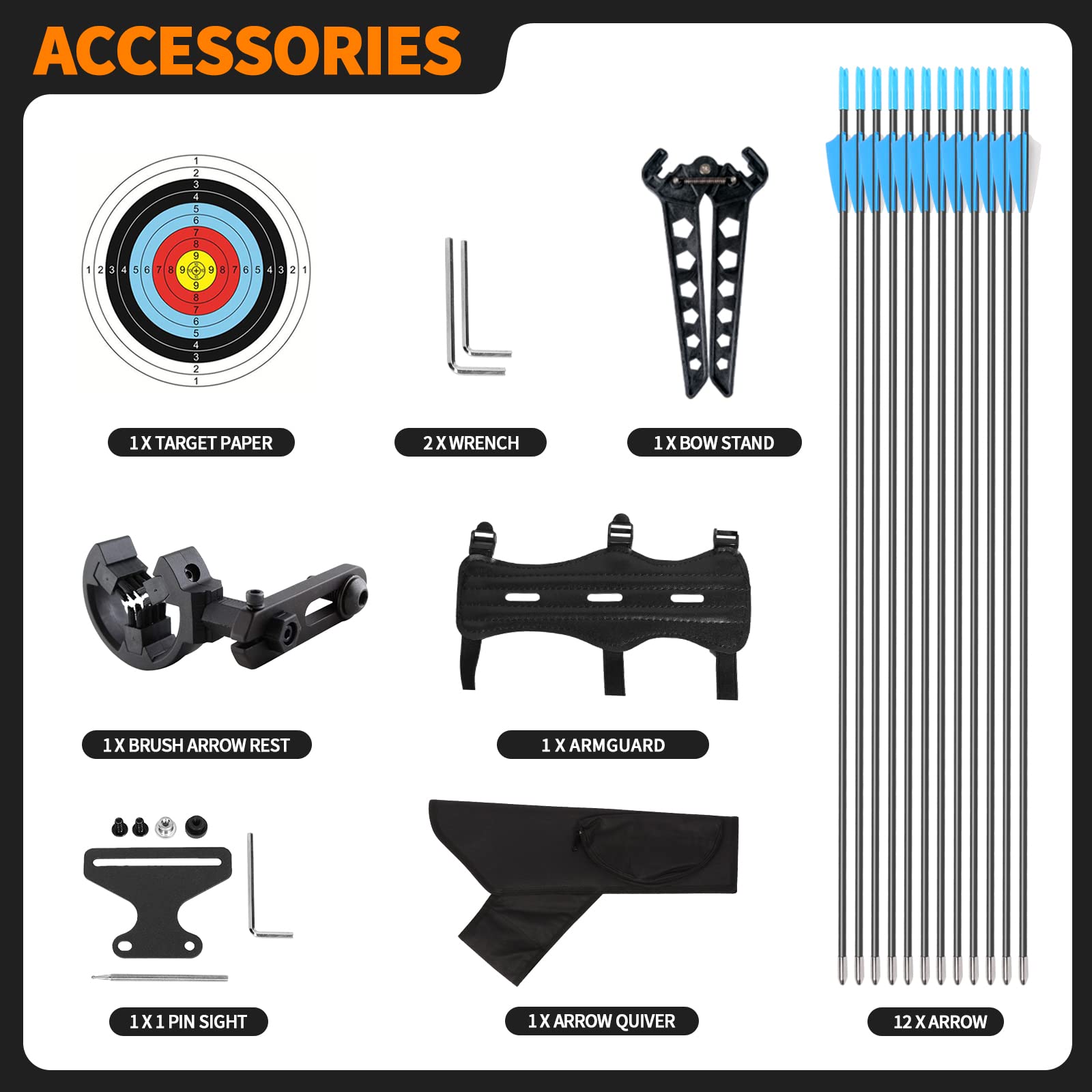 - PACKAGE INCLUDES: 1 x Compound bow; 1 x Single pin bow sight; 1 x Brush arrow rest; 1 x Arrow quiver; 1 x Target paper; 1 x Armguard; 12 x Arrow; 3 x Wrench; 1 x Instructions.