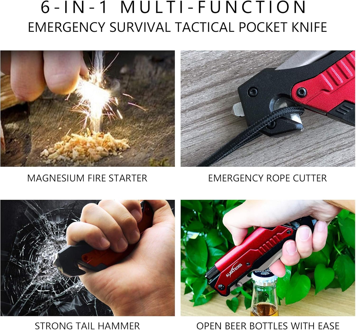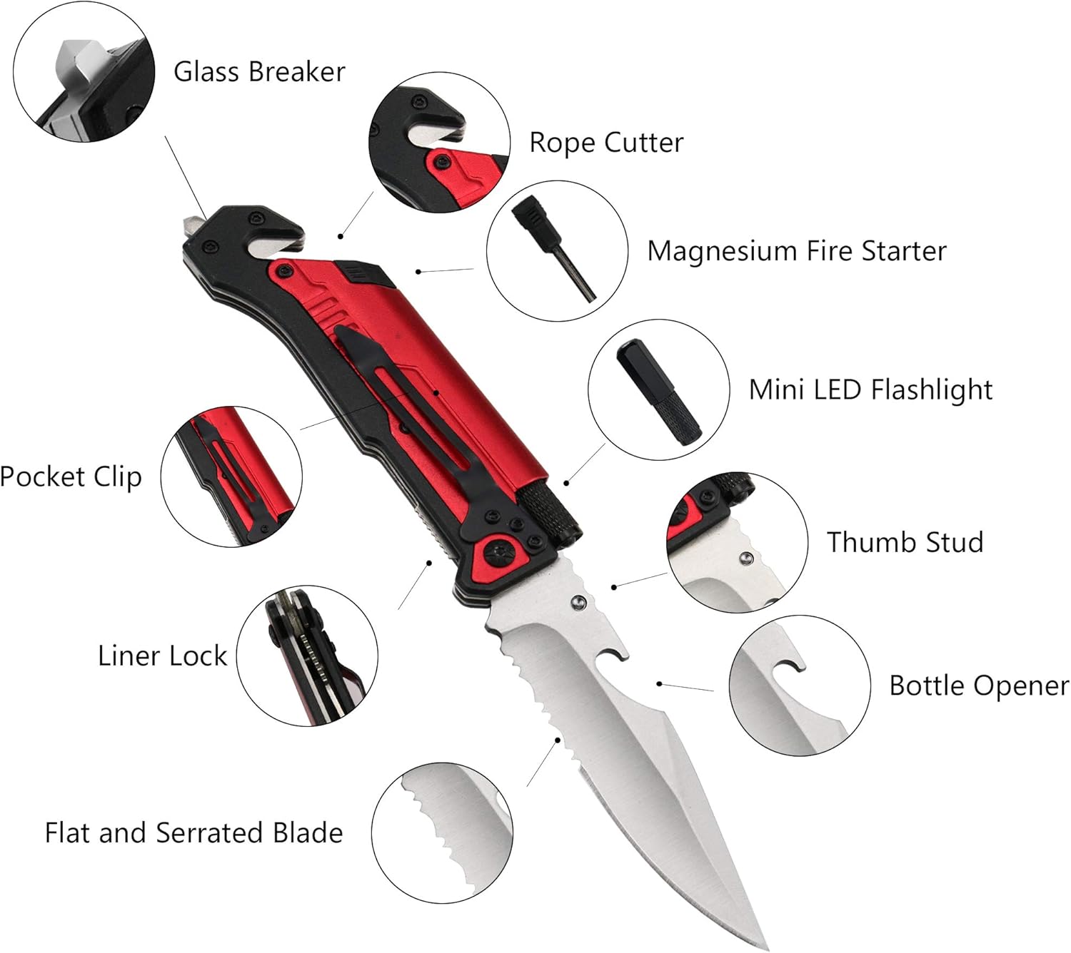 - Ultimate 6-in-1 Survival Tool: Professional-grade folding knife with integrated LED light, seatbelt cutter, glass breaker, magnesium fire starter, and bottle opener - your complete emergency preparedness solution.
