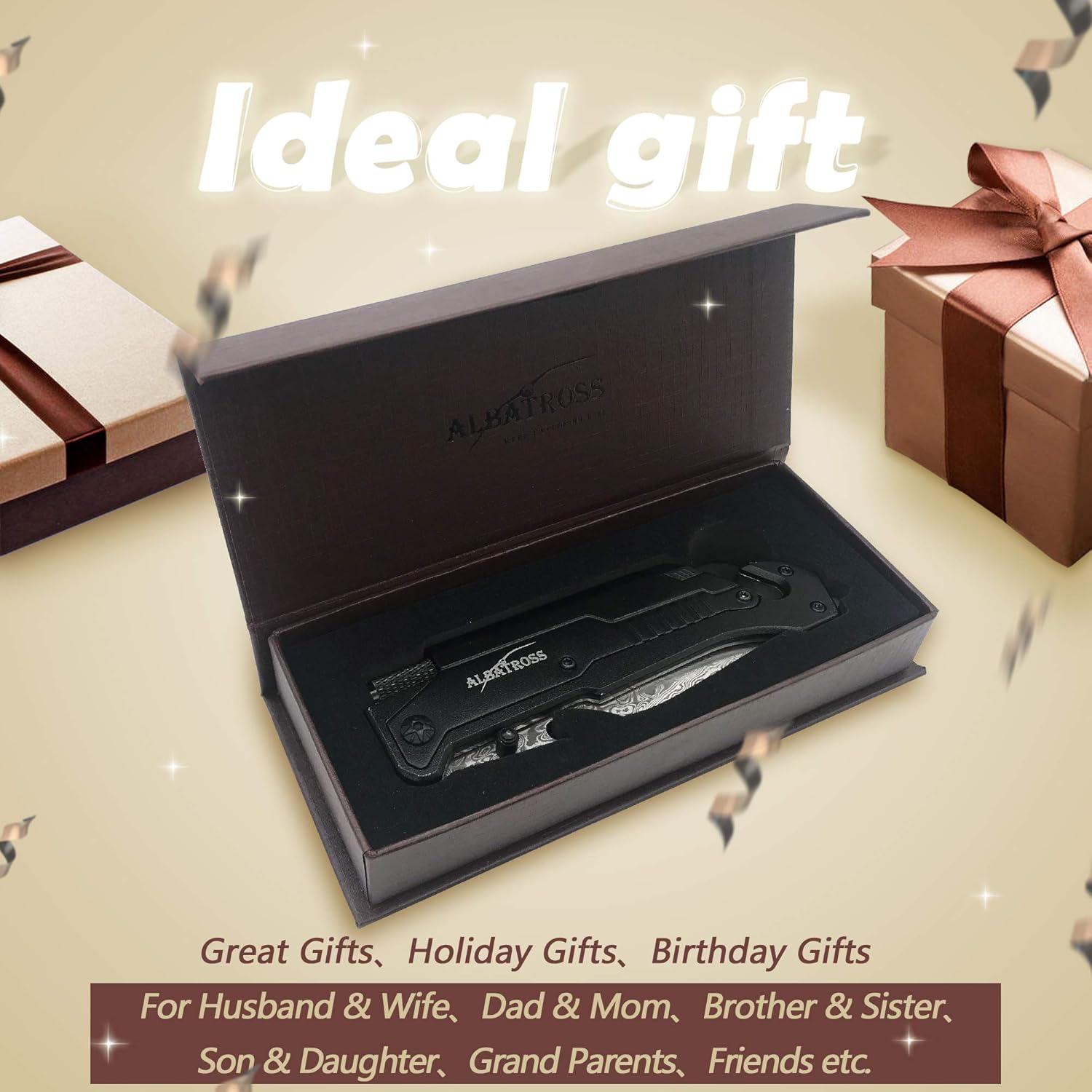 ALBATROSS 6-in-1 Survival Tactical Military Folding Pocket Knives with LED Light,Seatbelt Cutter,Glass Breaker,Magnesium Fire Starter,Bottle Opener;Multi-Function Emergency Tool(Black)